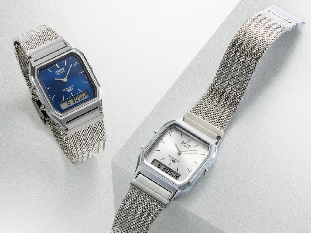 В продажу поступили две версии: с темно-синим циферблатом AQ230EM-2A и с серебряным циферблатом AQ230EM-7A. Обе модели имеют привычную квадратную форму с аналоговыми стрелками вверху и цифровыми показаниями, расположенными в нижней трети. Эта компоновка почти не изменилась с 1990-х годов, но сетчатый ремешок придает ей более полированный вид.