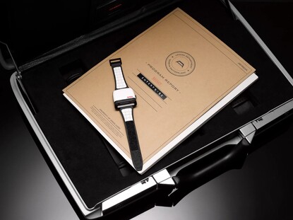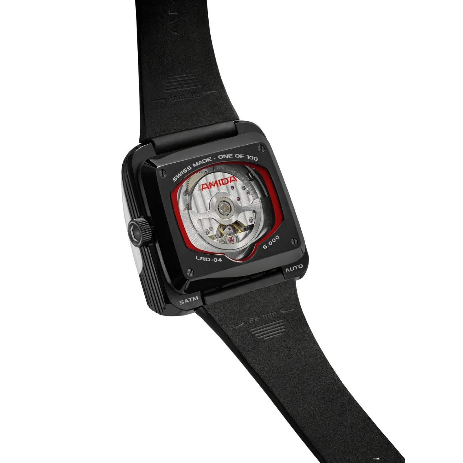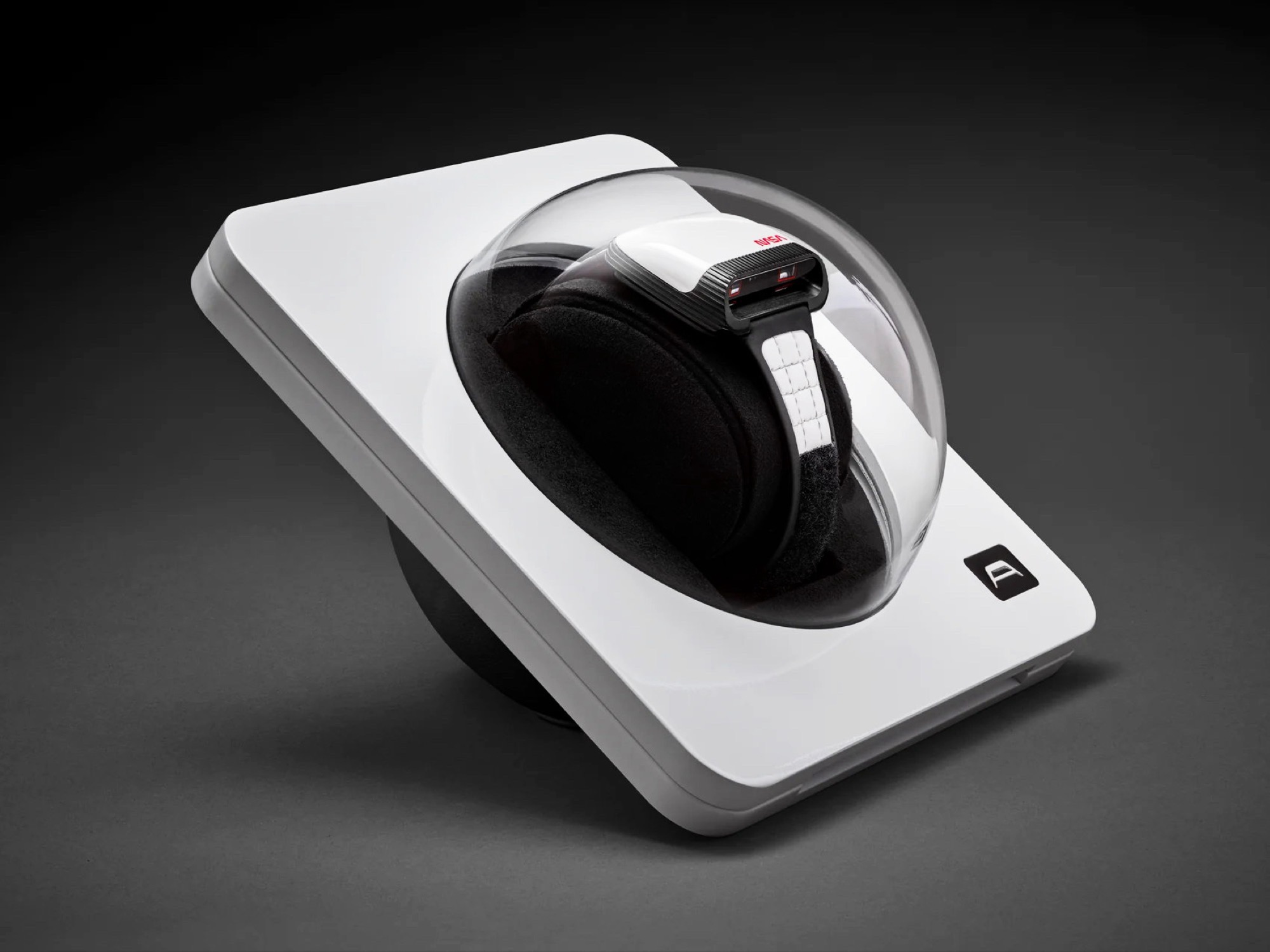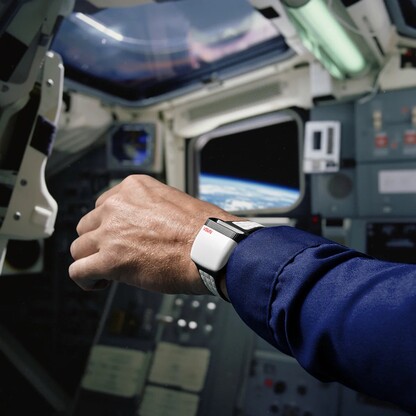 Ремешок выполнен из белой кожи с застежкой-липучкой, которую используют астронавты, что позволяет плавно регулировать длину ремешка. Задняя крышка выполнена из нержавеющей стали и открывает вид на механизм Soprod Newton P092, который оснащен 23 рубинами и нуждается в подзаводе лишь каждые 44 часа. Почти квадратный корпус имеет длину 39 миллиметров, высоту 15,6 миллиметров и вес 90 грамм