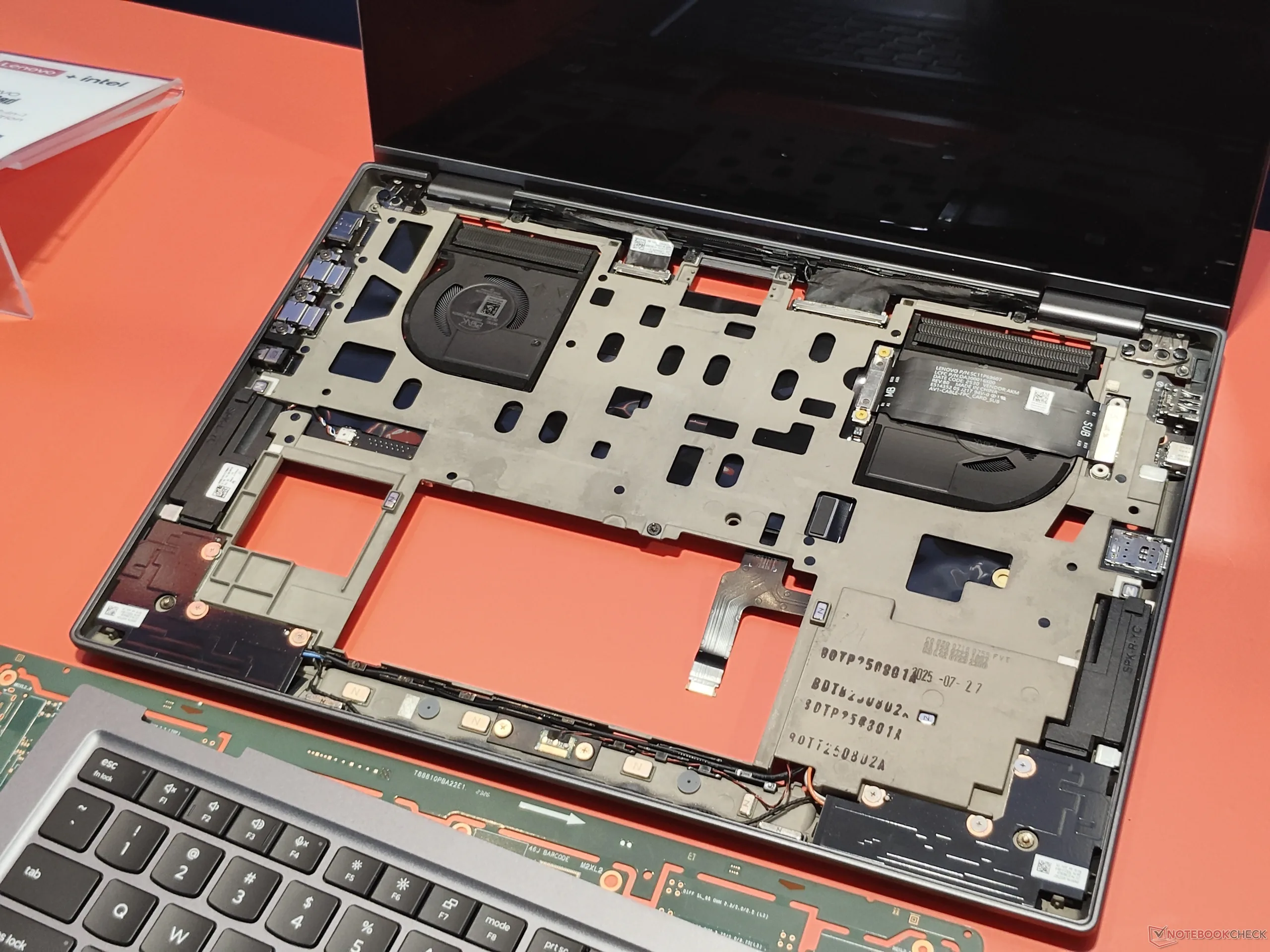 Еще одно преимущество - более эффективное использование доступного пространства, отсюда и "пространственная рамка". Разместив некоторые компоненты на другой стороне новой средней рамки, например, разъемы дисплея и антенны Wi-Fi, Lenovo удалось освободить ценное пространство, которое было использовано для увеличения размера системы охлаждения - она позволяет охлаждать до 30 Вт при полной нагрузке вместо всего 22,5 Вт у предыдущей модели X1 Carbon Gen 13(доступна на Amazon). Это особенно удобно с новыми процессорами Panther Lake, поскольку Intel Core Ultra X7 требуется больше энергии, чтобы работать значительно лучше, чем предыдущие процессоры Lunar Lake. Кроме того, благодаря новой материнской плате меньшего размера Lenovo удалось сделать порты USB C модульными и вынести некоторые другие порты на отдельную дочернюю плату.
