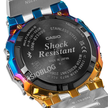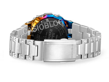 На суперчетких обновленных рендерах более подробно показано, как Casio использует радужное ионное напыление. Вместо того, чтобы полностью окрашивать корпус, акценты наносятся выборочно по структурным краям корпуса, особенно по нижним и боковым сегментам. Синие и фиолетовые тона более заметны в нижней половине. Они переходят в более теплые золотые и оранжевые оттенки в районе верхних ушек и стыков безеля.