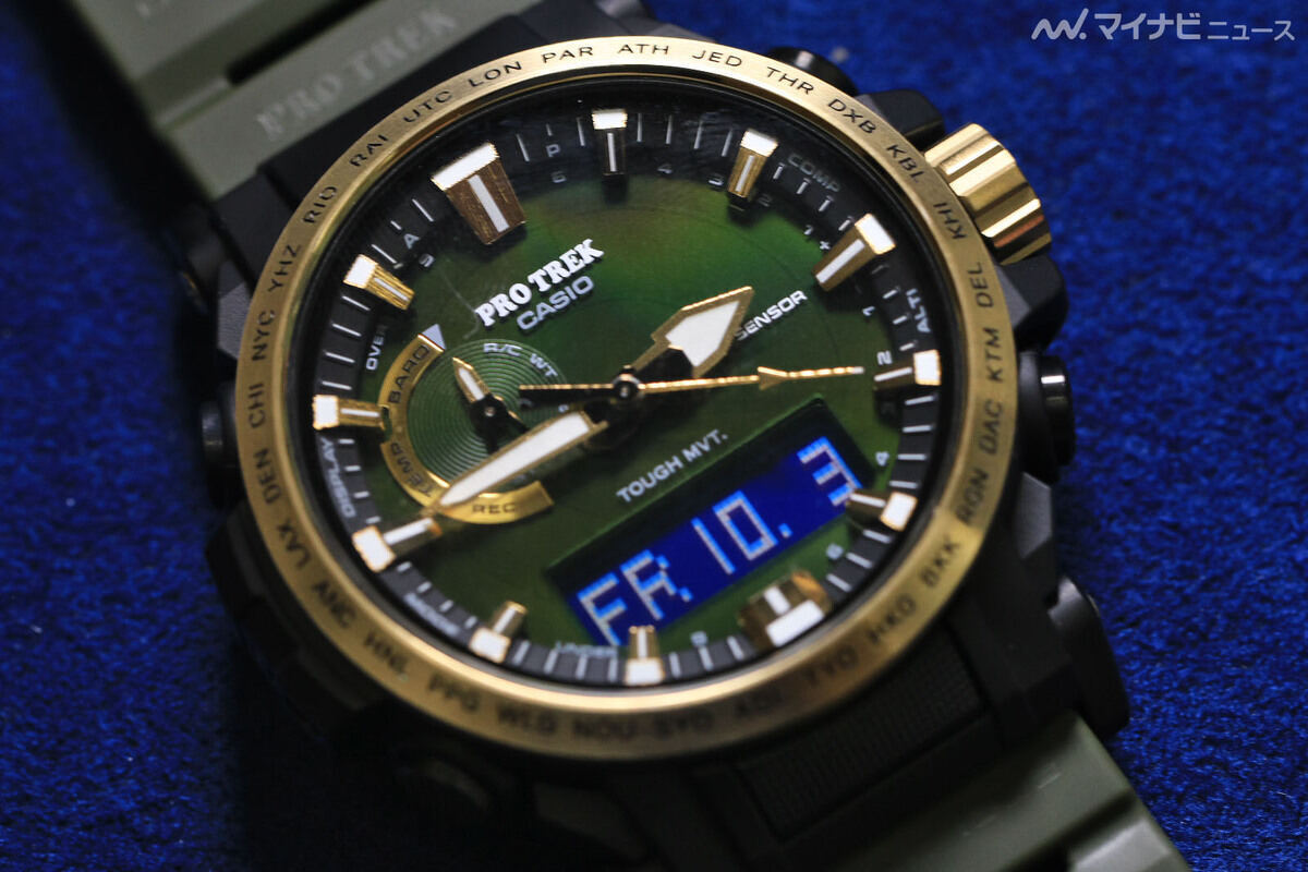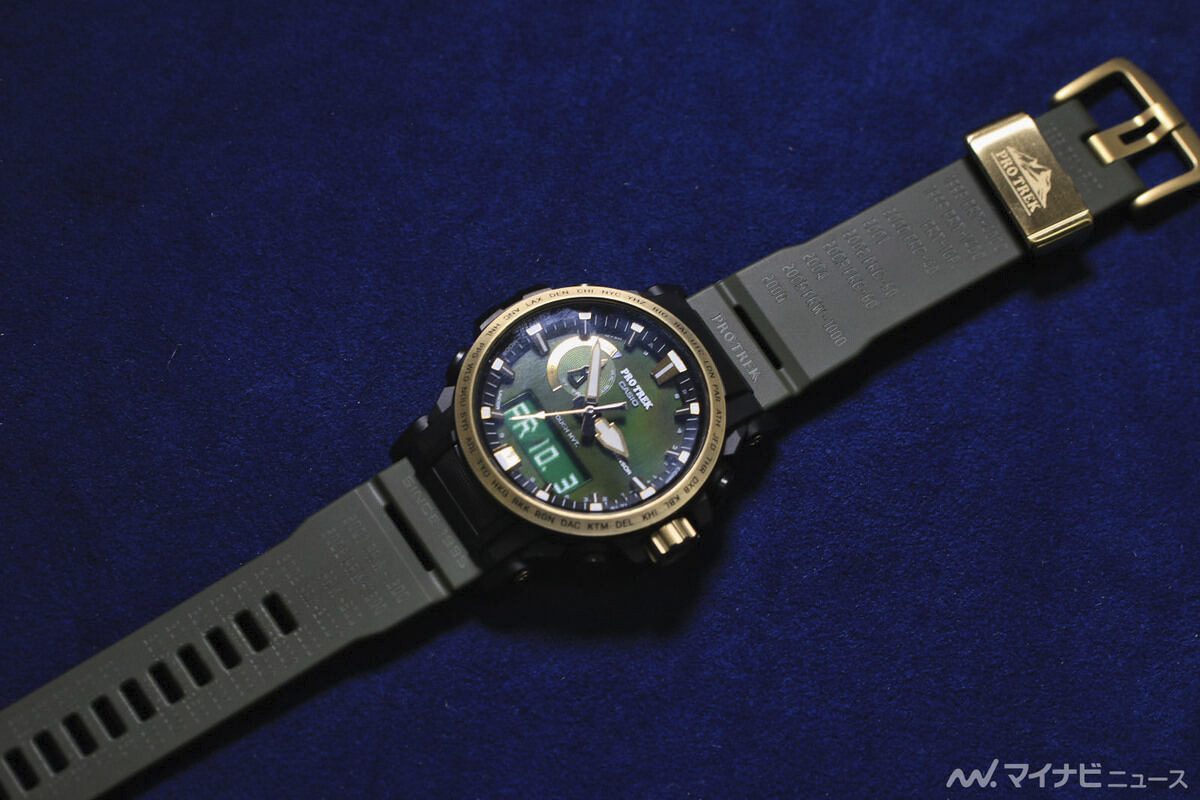 При ближайшем освещении PRW-61ANS-3 демонстрирует насыщенный оливково-зеленый циферблат с большой глубиной. Золотые индексы и стрелки, нанесенные методом парового напыления, ловят свет с блеском, что, в свою очередь, делает аналоговые элементы более яркими, но не слишком отражающими. Даже цифровой дополнительный циферблат теперь сидит чище. Он более четко обрамлен в нижней части циферблата. Также легче заметить радиальную текстуру под логотипом Pro Trek.