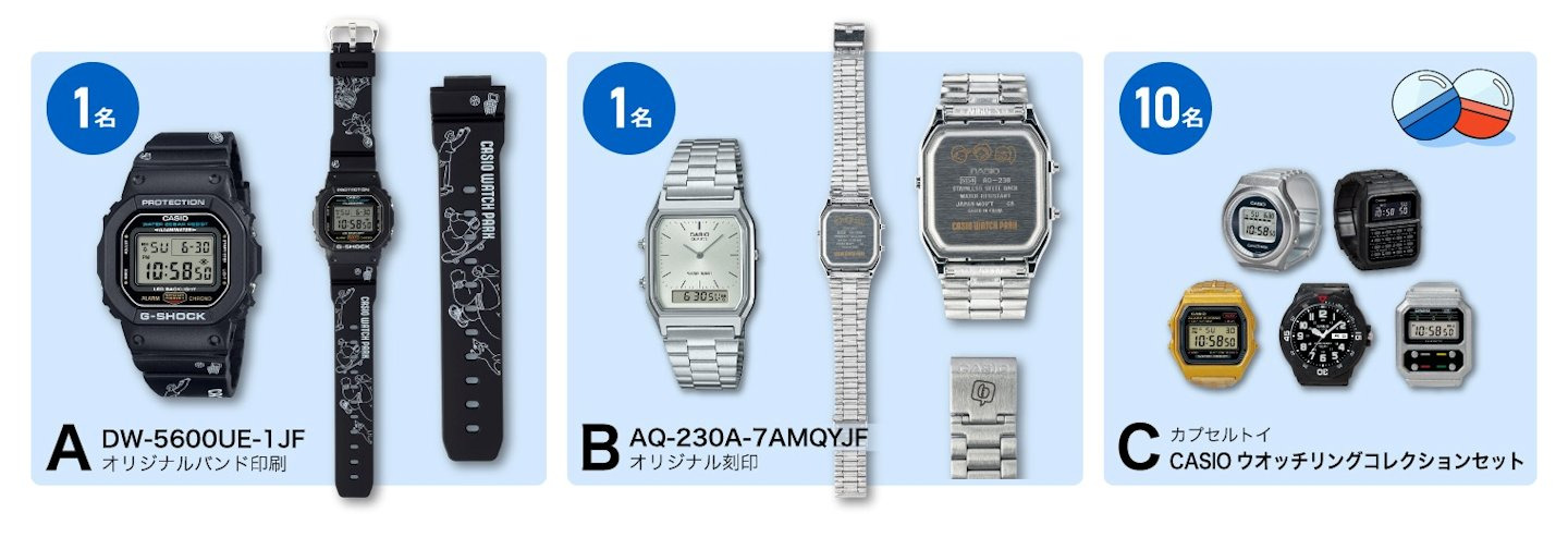 Среди призов - часы DW-5600UE-1JF со специальным ремешком (один победитель), часы AQ-230A-7AMQYJF с оригинальной гравировкой (один победитель), а также наборы капсульных игрушек Casio для десяти победителей. Право на участие в конкурсе зависит от наличия Casio ID в регионе пользователя; никаких конкретных ограничений по странам объявлено не было.