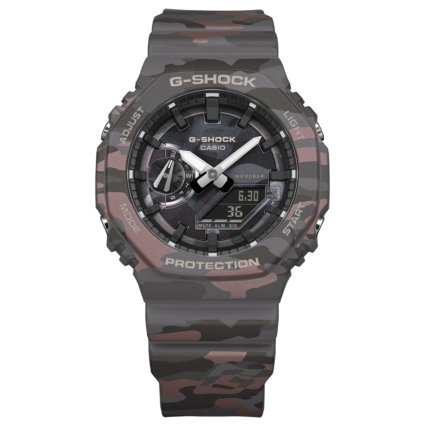 Серия GA-2100 от Casio, отличающаяся восьмиугольным безелем и гибридным аналогово-цифровым дисплеем, теперь официально получила три новых цветовых решения: песочный (GA-2100CM-5), серый (GA-2100CM-8) и третий вариант с красноватыми оттенками (GA-2100CMD). На смоляных компонентах также присутствует металлический принт. Этот процесс производства создает эффект многослойного камуфляжа, который включает в себя идентификатор бренда - знак G - интегрированный непосредственно в рисунок. Если в предыдущих итерациях GA-2100 использовалась литая цветная смола или стандартная тампонная печать, то использование металлических деталей на этих моделях призвано обеспечить более высокую степень визуальной глубины по сравнению со стандартными вариантами.
