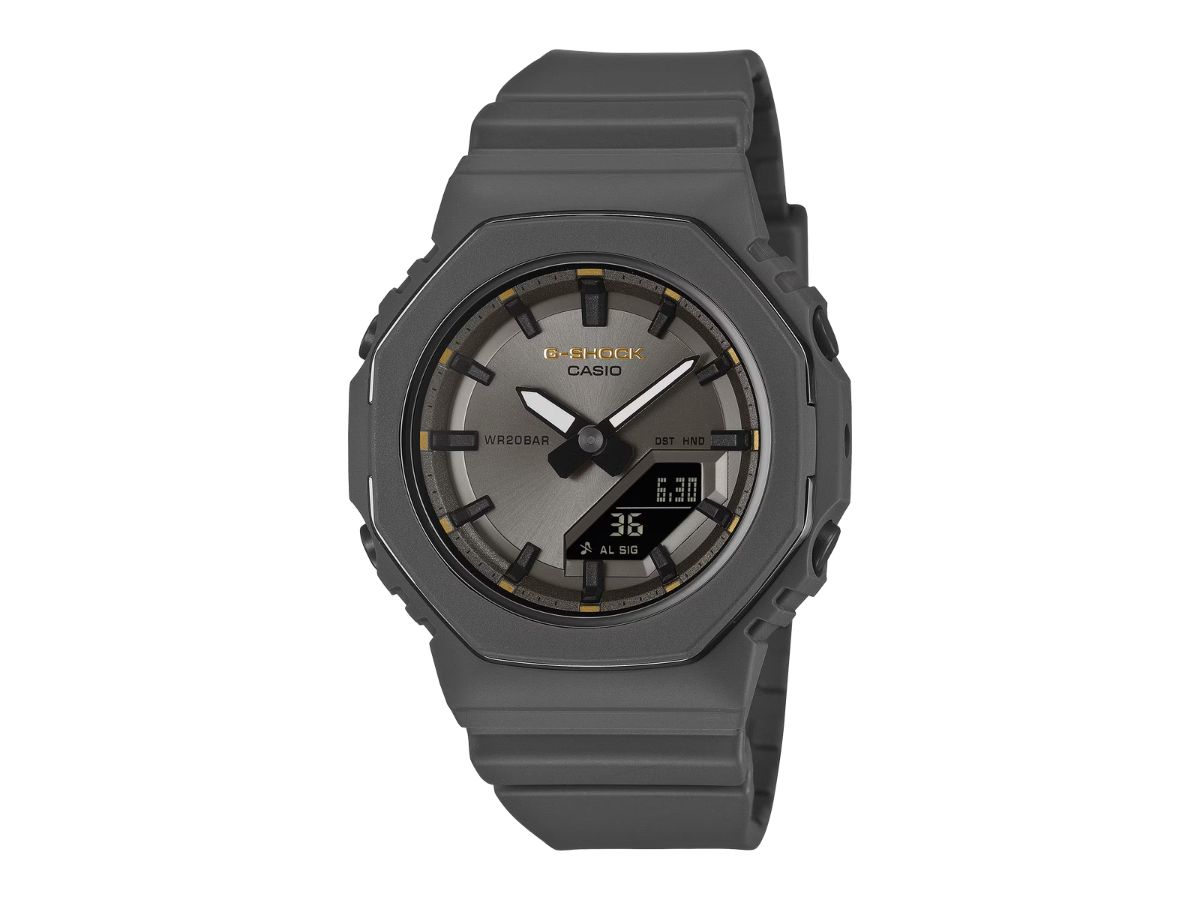 G-Shock GMAP2126W-8A от Casio - это аналогово-цифровые часы с двумя аналоговыми стрелками, расположенными на темно-сером металлическом циферблате с золотыми акцентами. Как утверждается, точность хода составляет 15 секунд в месяц, а функция сдвига стрелок гарантирует, что вставленный цифровой дисплей никогда не будет затенен. На экране отображается информация о дате и дне недели. Кроме того, эта модель предлагает такие инструменты, как таймер обратного отсчета, секундомер с точностью до 1/100 секунды, будильники и почасовые сигналы времени. Пользователи могут выбрать один из 48 городов для настройки часового пояса. Стоит также отметить, что модель водонепроницаема до 200 м.