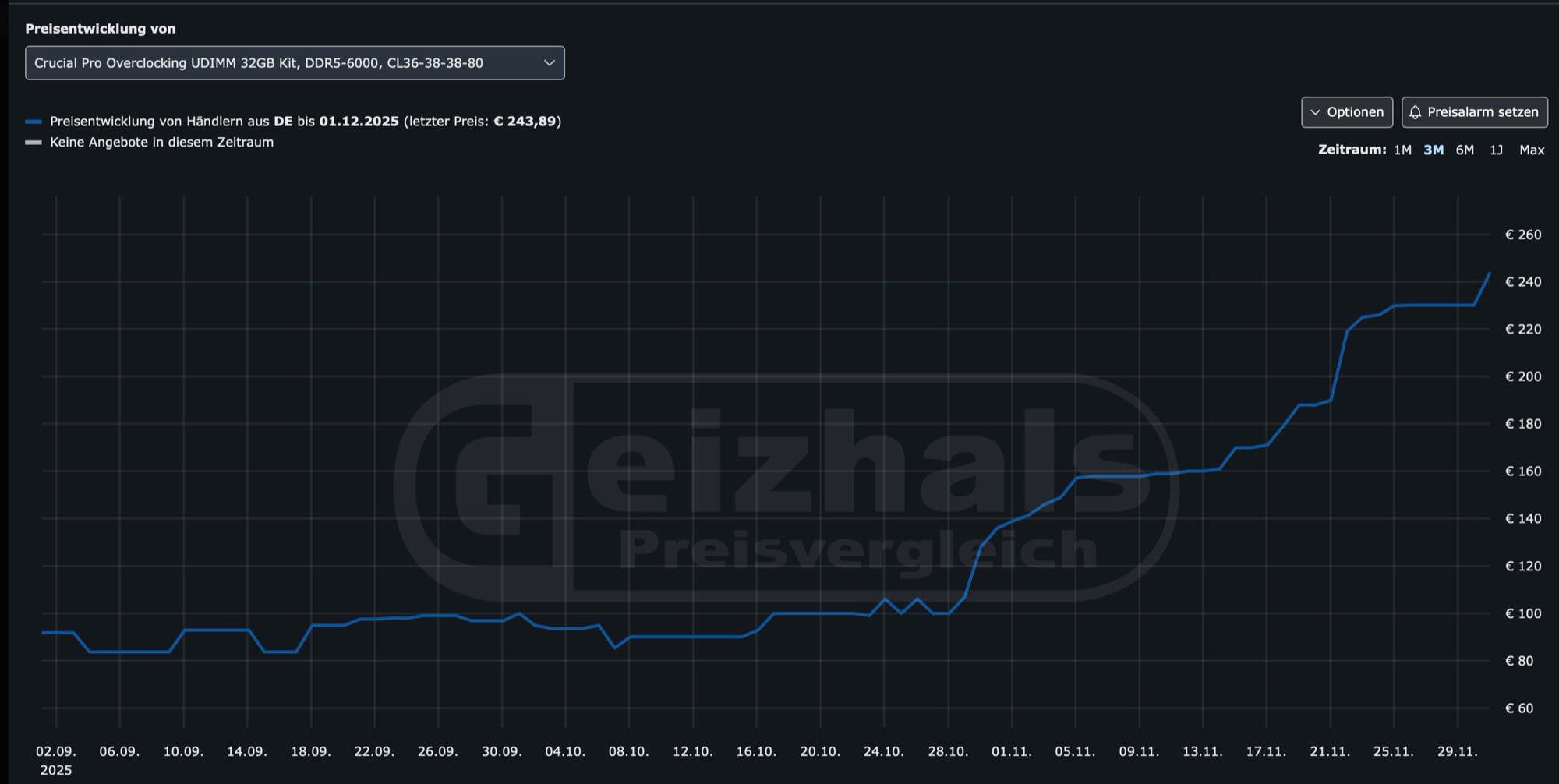 В последние месяцы цены на память растут с пугающей скоростью. Даже бюджетный комплект оперативной памяти объемом 32 ГБ сейчас стоит более $220, подорожав за последние три месяца в три раза. По мнению гиганта рынка памяти TeamGroup, цены на DRAM будут продолжать расти в течение 2026 года, и облегчения не предвидится, по крайней мере, до 2027 года, когда производственные мощности, наконец, догонят растущий спрос, вызванный ведущими компаниями в области искусственного интеллекта, такими как OpenAI.