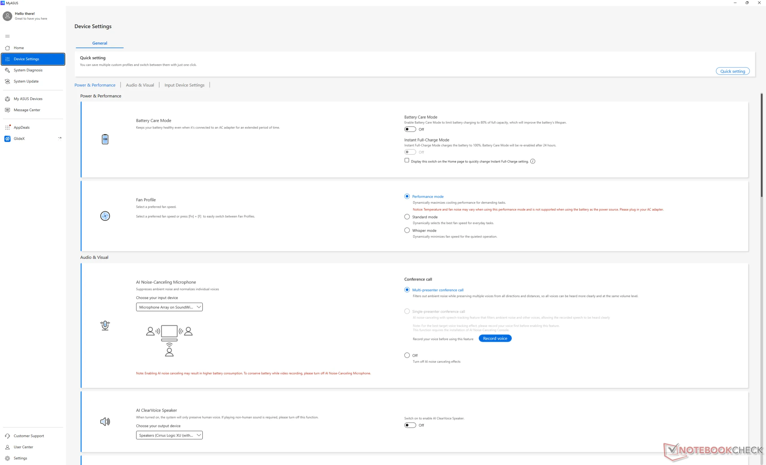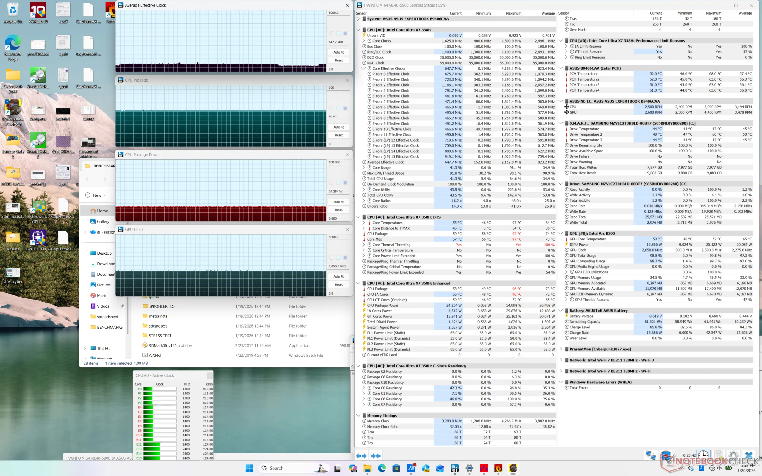 На Asus ExpertBook Ultraоднако, максимальная производительность процессора достигается при одном условии: питании от сети. Как видно на скриншотах ниже, работа от батареи может снизить производительность примерно на 10-15%. Программное обеспечение MyAsus даже подтверждает это красной надписью: "Этот режим производительности не поддерживается при использовании батареи в качестве источника питания".