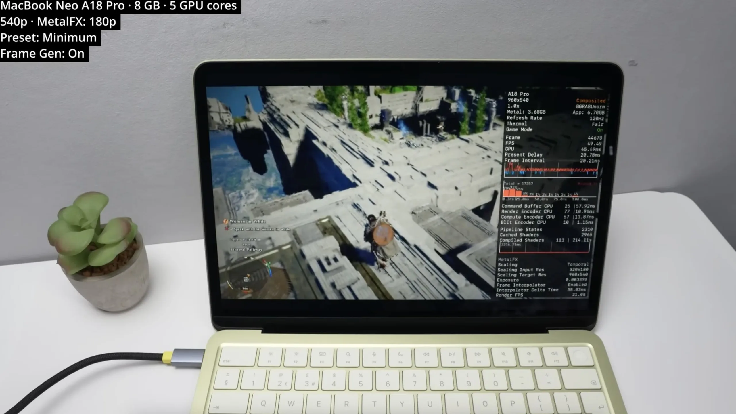 При минимальных настройках, повышении масштаба MetalFX со смехотворных 180p до 540p и включенной генерации кадров MacBook Neo удается запустить Crimson Desert со скоростью около 50 кадров в секунду. Учитывая, что A18 Pro с 5-ядерным GPU имеет аппаратное ускорение сетчатых шейдеров, производительность оказывается почти такой же, как у M1.