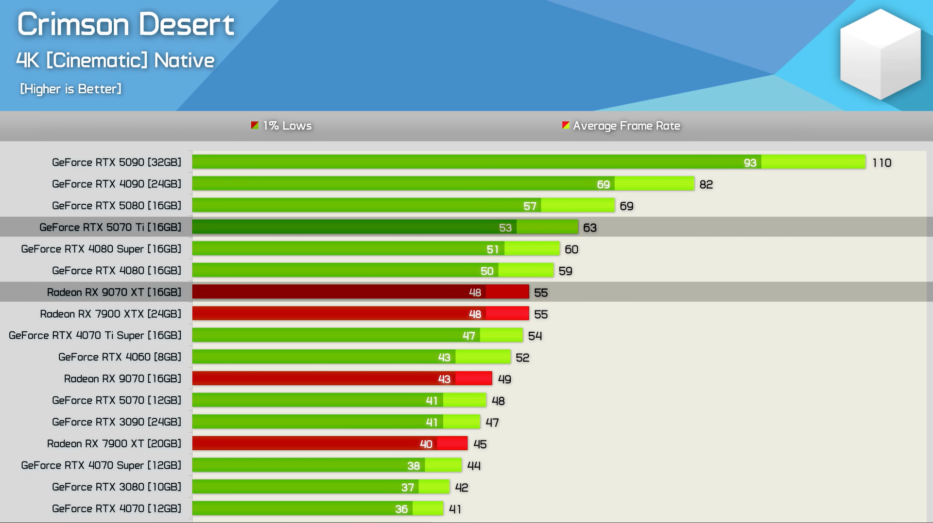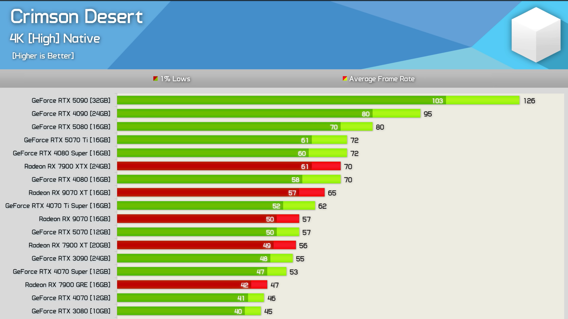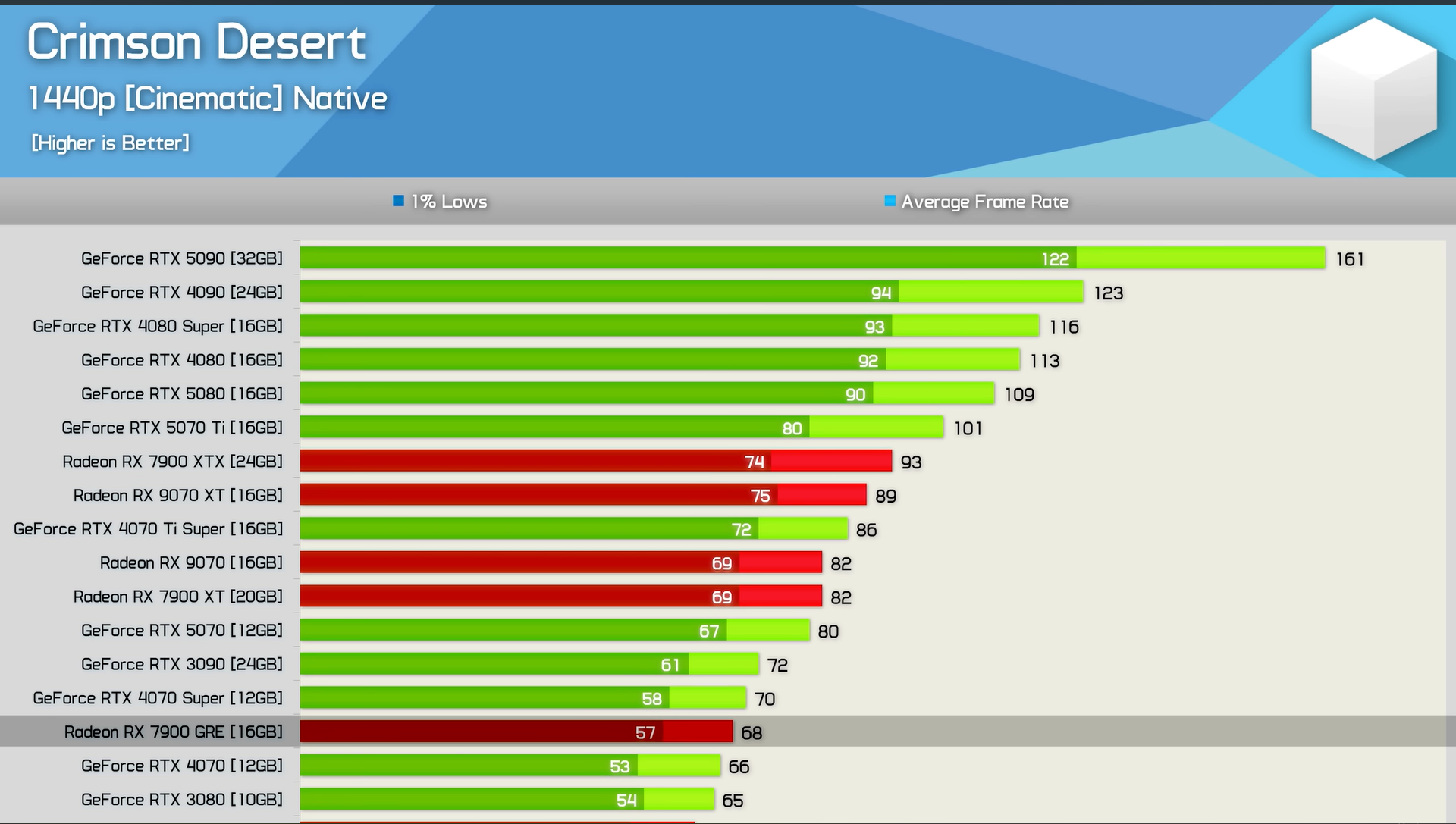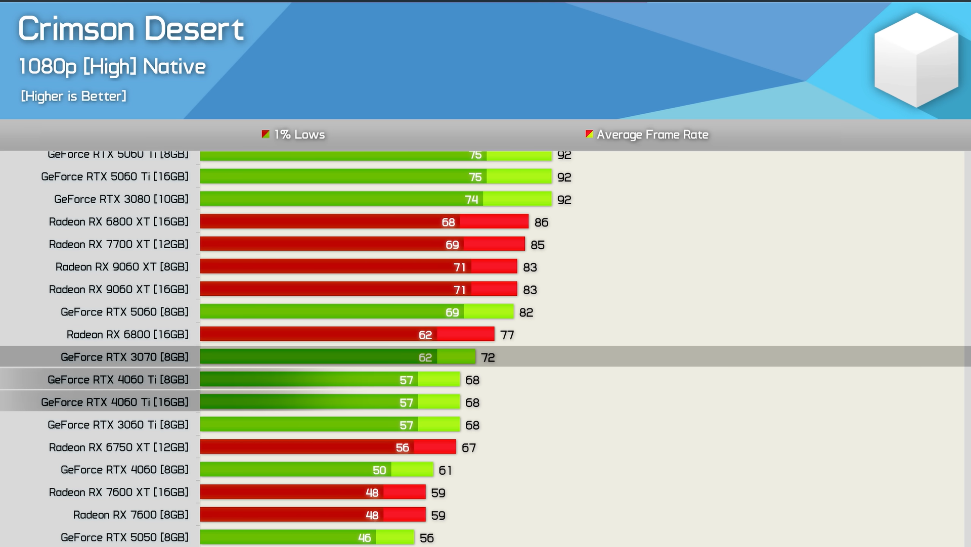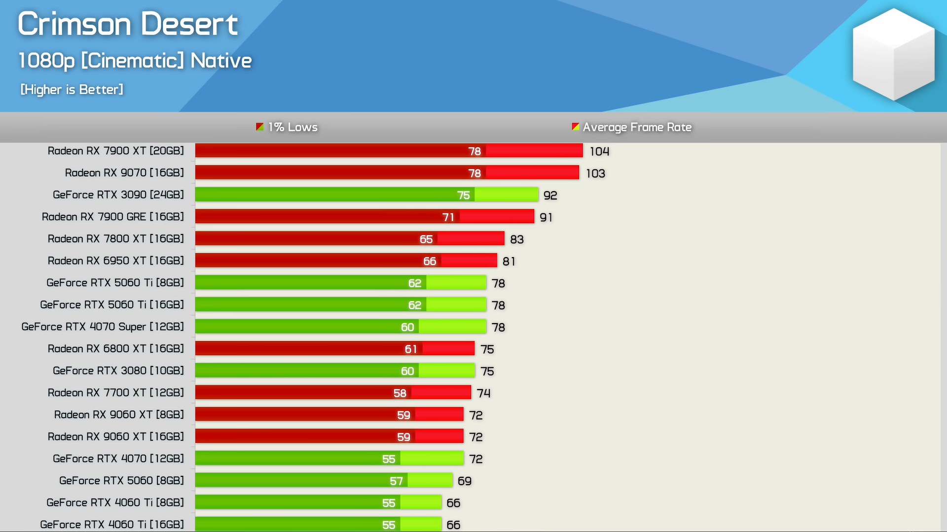 Hardware Unboxed измерил производительность Crimson Desertс 40 GPU и Ryzen 7 9800X3D. Результаты говорят сами за себя: Crimson Desert демонстрирует стабильные 60 FPS даже на таких скромных GPU, как RX 7600.