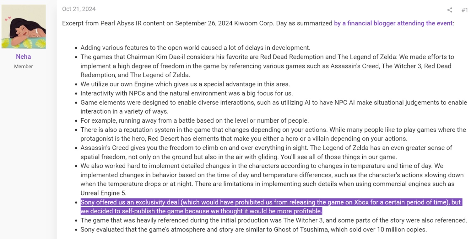 Forbes обнаружил это предложение в отчете инвесторов Pearl Abyss, переведенном на форумах ResetEra. По словам представителей компании, Sony высоко оценила проект экшен-адвенчуры с открытым миром. Если бы ее потенциальный партнер принял "выгодные условия", Crimson Desert стала бы Эксклюзивом для PS5 на один год. PlayStation также запросила права на распространение на ПК.