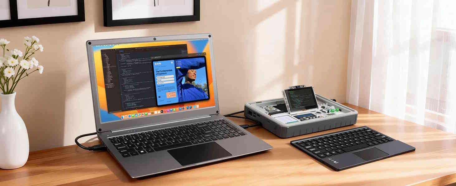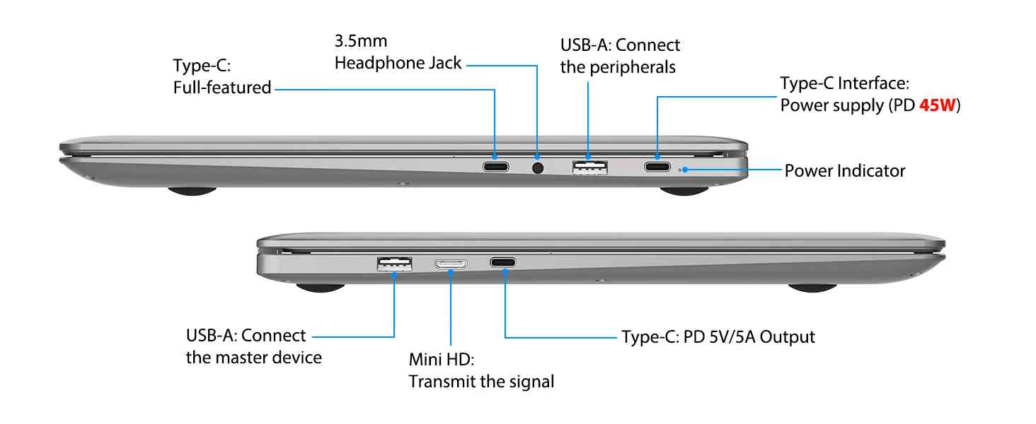 Раскладка клавиатуры - QWERTY, включая нумпад и тачпад. Устройство может получать как электрическую энергию, так и сигналы изображения через USB-C. Всего имеется три порта USB-C и один порт mini HDMI. Дополнительные порты включают два порта USB-A, выход jack и два динамика. Модель весит 1 545 грамм и имеет размеры 372 × 244 × 26 миллиметров. Более подробную информацию Вы можете найти на странице продукта https://www.elecrow.com/crowview-note-15-6-all-in-one-portable-monitor-phone-to-laptop-device.html?idd=6.