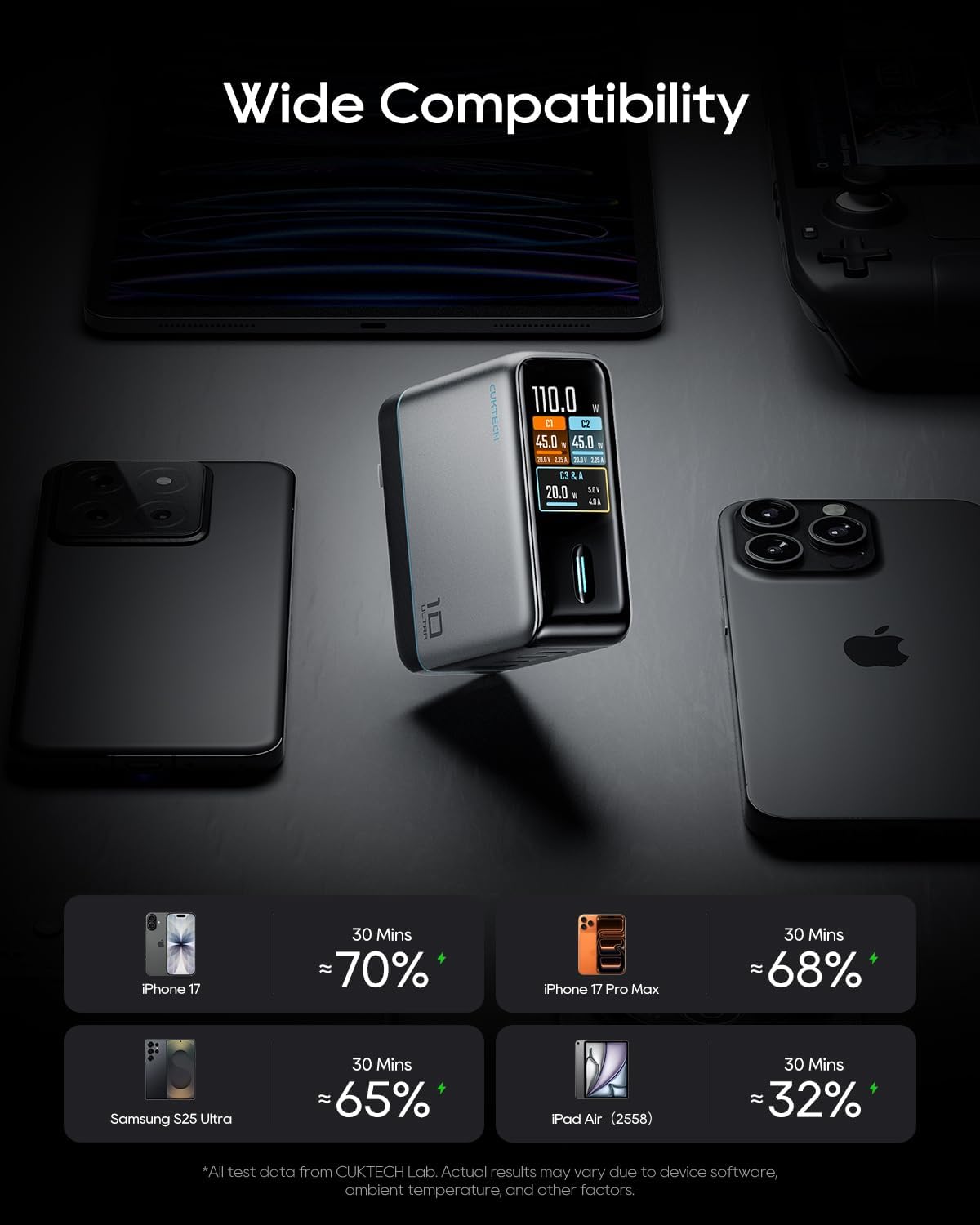 Кроме того, Cuktech встроил в зарядное устройство 8-слойную систему защиты, предохраняющую от перенапряжения, короткого замыкания и других электрических рисков. Кроме того, оно совместимо со всеми моделями, начиная от MacBooks, iPhone 17/16 и Galaxy S26, Pixel и многими другими.