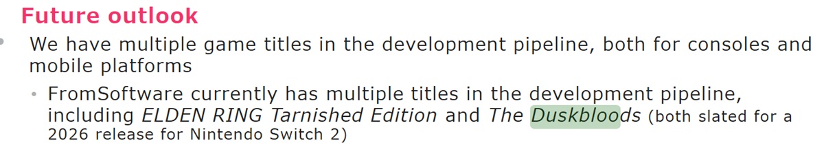 В последнее время поклонники Nintendo нечасто слышали о паре ожидаемых FromSoftware. Обе игры, ориентированные на многопользовательскую игру The Duskbloods и Порт Elden Ring Switch 2 появились в апреле 2025 года. Последняя Nintendo Direct Partner Showcase не было представлено ни одной из игр. Тем не менее, материнская компания студии по-прежнему ожидает даты выхода проектов в 2026 году.