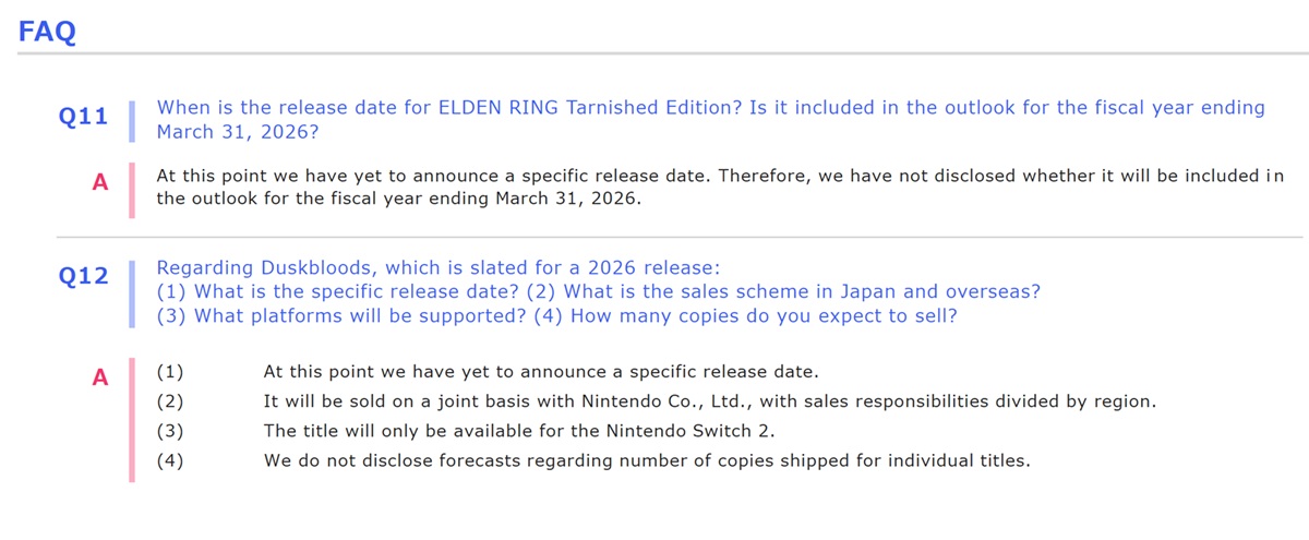Kadokawa включила обновленную информацию в свой отчет за 3 квартал 2026 финансового года. Говоря о снижении операционной прибыли по сравнению с предыдущим годом, компания упомянула Игры Switch 2. The Duskbloods и Elden Ring Tarnished Edition "обе запланированы к выпуску на 2026 год"