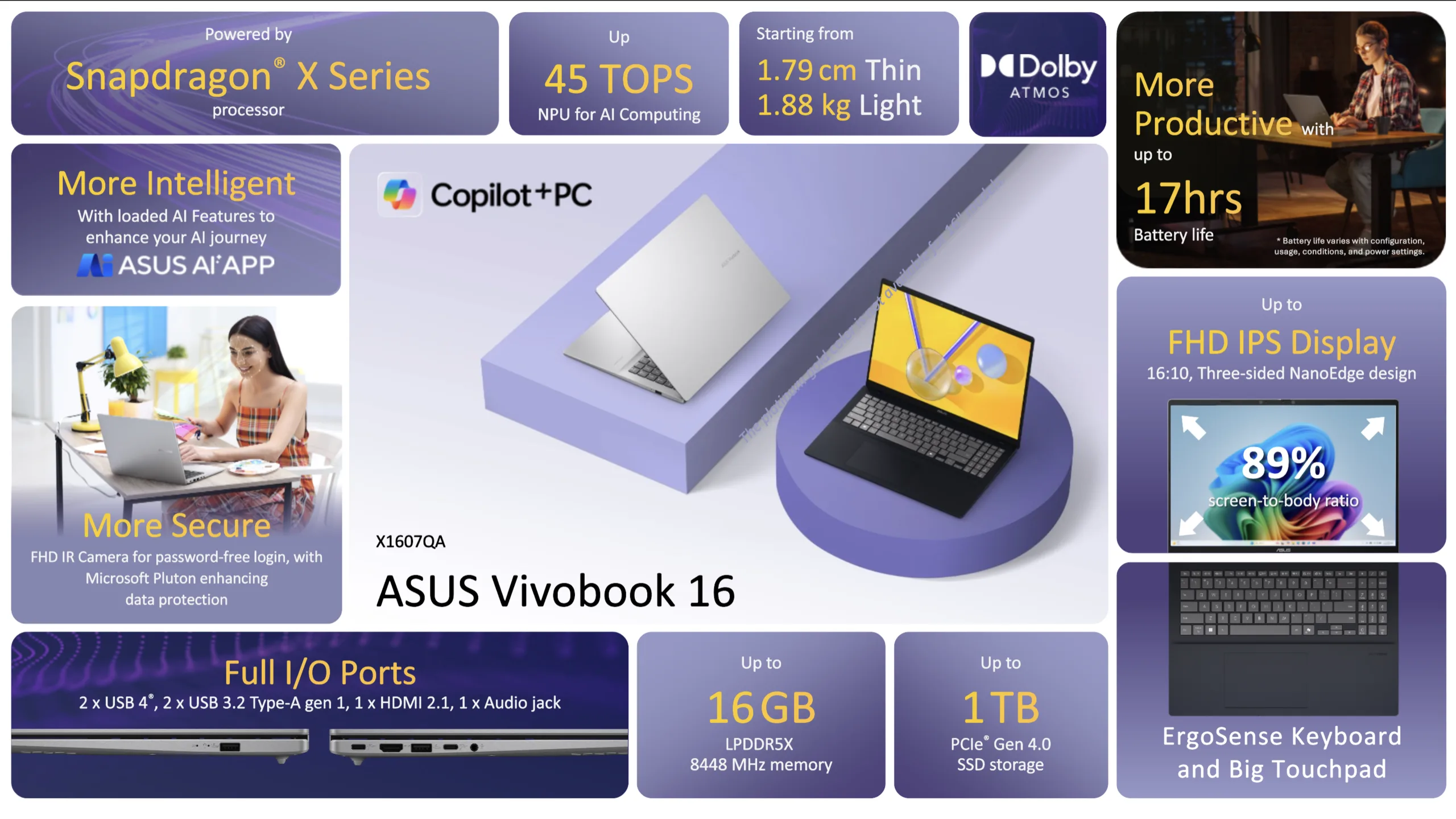 Более того, Asus также утверждает, что ноутбук поставляется с военного класса прочностью и временем автономной работы до 17 часов. Другие характеристики включают в себя ИК-камеру Full-HD, динамики с поддержкой Dolby Atmos, функции искусственного интеллекта и до 50 TOPS NPU, что должно обеспечить достойную производительность при работе с искусственным интеллектом.