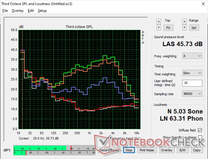 Решение по охлаждению для сборки Core Ultra X7 идентично сборкам Core Ultra 5 или Ultra 7, несмотря на более высокое энергопотребление, о котором говорилось выше. Поэтому шум вентиляторов, как правило, громче, чтобы компенсировать это. Сдвоенные вентиляторы в конфигурации Core Ultra X7 быстрее достигают высоких оборотов и становятся более заметными, чем вентиляторы в менее мощных сборках Core Ultra, не относящихся к классу X. Например, шум вентиляторов быстрее достигает 38 дБ(А) при работе Cyberpunk 2077 и даже достигает пика почти в 49 дБ(А) при полной нагрузке на процессор.