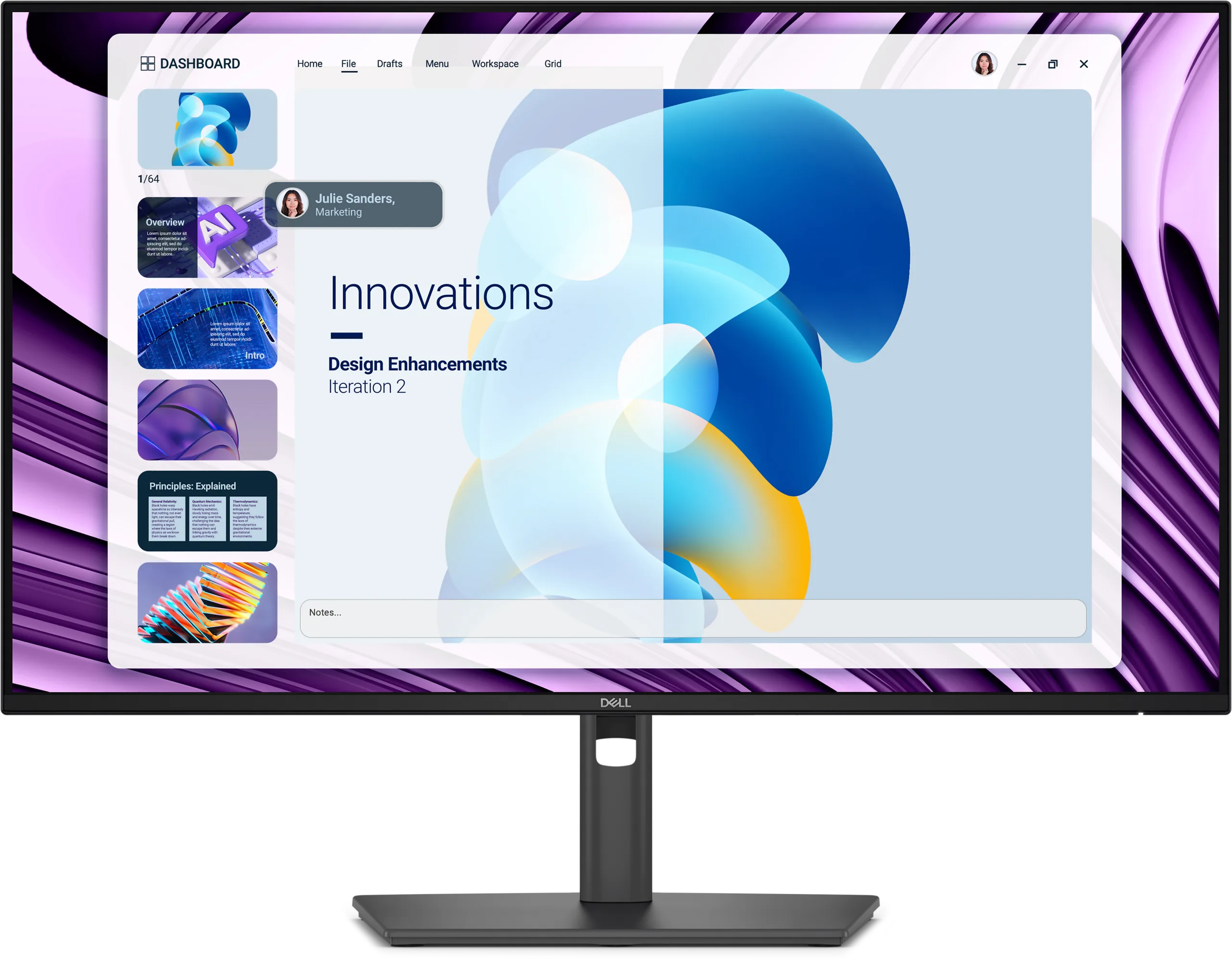 Монитор имеет разрешение 1920 × 1080, соотношение сторон 16:9, частоту обновления 120 Гц и время отклика 8 мс. Dell утверждает, что экран имеет антибликовое твердое покрытие, и что монитор можно наклонять вперед или назад, поворачивать на 45° в сторону и даже поворачивать на 90° из горизонтального положения в вертикальное. Пользователи также могут регулировать высоту до 150 мм.