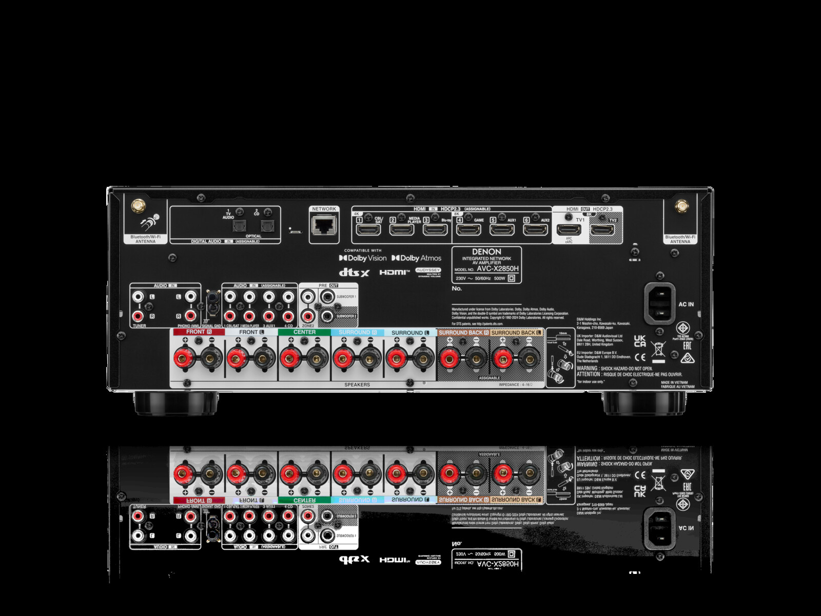 Помимо 8K-видео и 4K-апскейлинга, Denon AVC-X2850H поддерживает Dolby Atmos и DTS:X, а также другие функции. Каналы 7.2 также могут быть настроены как 5.2.2 Dolby Atmos или DTS:X. Производитель AVR также обещает чистый и динамичный звук благодаря сильноточным усилителям и поддержке форматов воспроизведения до 24 бит/192 кГц.