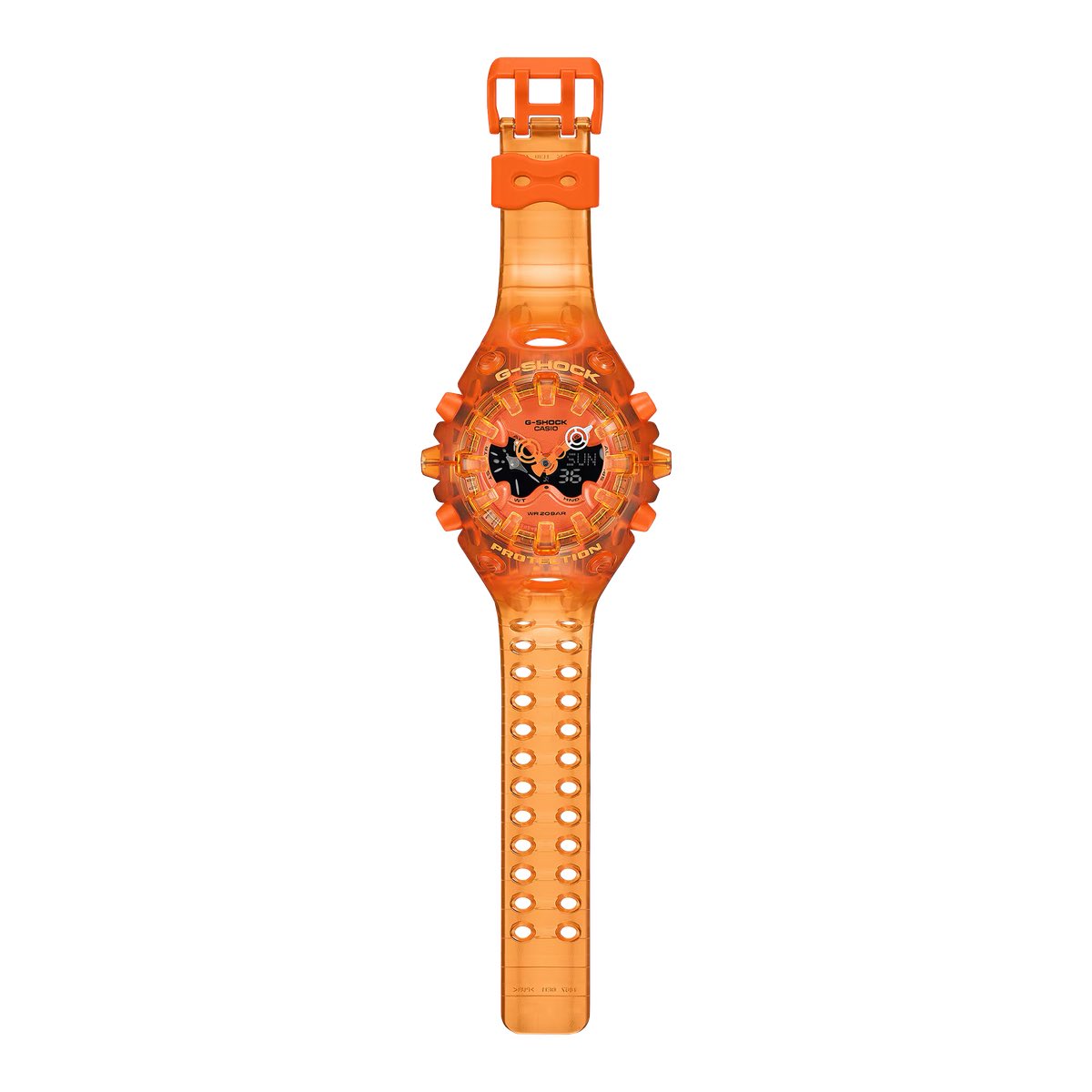 Цифро-аналоговый Transparent Pack состоит из моделей GA-V01SKE-3A (неоново-зеленый), GA-V01SKE-4A (оранжевый), GA-V01SKE-6A (фиолетовый) и GA-V01SKE-8A (черный). Каждая модель оснащена большим перевернутым ЖК-дисплеем, напоминающим глаза пришельца. Оранжевый вариант https://www.casio.com/jp/watches/gshock/product.GA-V01SKE-4A/ выделяется среди других моделей и, похоже, заменяет серебристую модель из оригинальной линейки, которая впервые была представлена в Китае в феврале прошлого года.