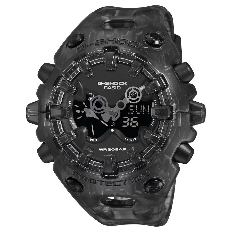 Компания Casio обновила свой GA-V01 серией из четырех новых прозрачных моделей. Новая серия Transparent Pack сохраняет футуристический, вдохновленный инопланетянами стиль часов, но заменяет массивные корпуса на прозрачные корпуса в стиле "скелет", а также представляет совершенно новый оранжевый цвет.