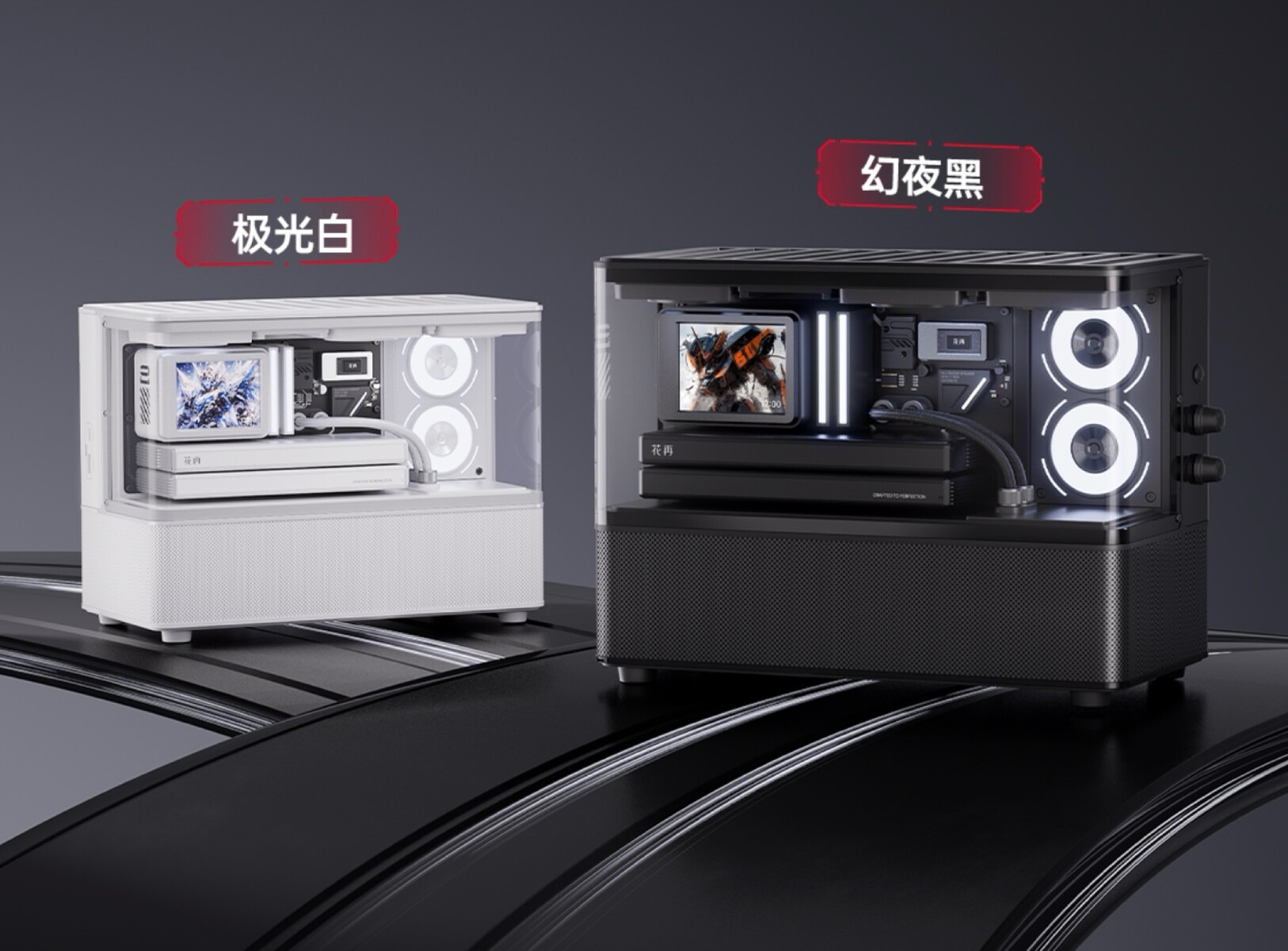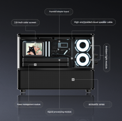 Толстые акустические кабели в оплетке напоминают каналы системы жидкостного охлаждения, а 2,8-дюймовый сенсорный экран символизирует процессорный кулер. Этот дисплей может не только отображать графику и анимацию, но и показывать текущую загрузку CPU и GPU, а также использование оперативной памяти подключенного компьютера, что делает иллюзию еще более эффектной. На задней панели колонки расположены порты USB-C и USB-A, каждый из которых способен заряжать подключенные устройства мощностью до 35 Вт