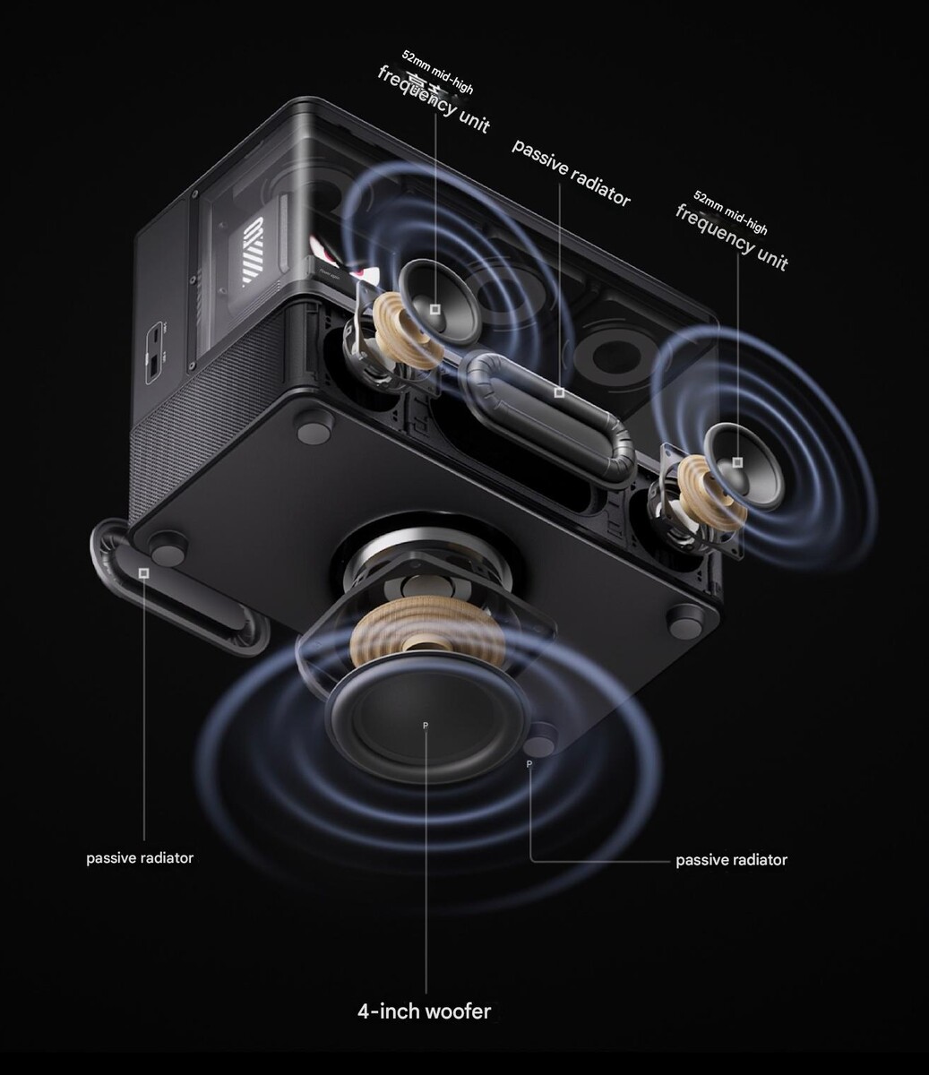 В нижней половине колонки расположены два 52-мм полнодиапазонных динамика, 100-мм НЧ-динамик и два пассивных радиатора для усиления низких частот. В колонку Edifier также встроен 60-ваттный усилитель. Колонка может быть подключена к ПК или смартфону через USB-кабель, AUX или Bluetooth 6.0.