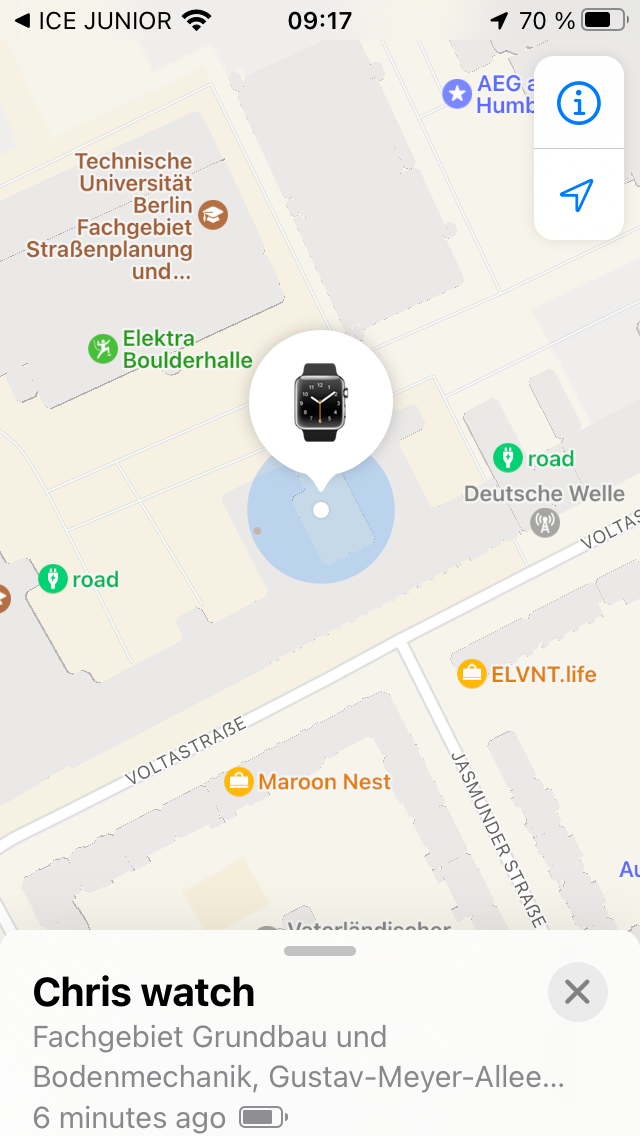 Вернувшись домой, iPhone правильно обновил местоположение - переместился из нашего дома в зал для скалолазания. Однако если Ваш ребенок окажется где-нибудь, где поблизости нет устройств Apple, отслеживание не сработает. Именно в этом случае GPS или часы с SIM-картой имеют явное преимущество.