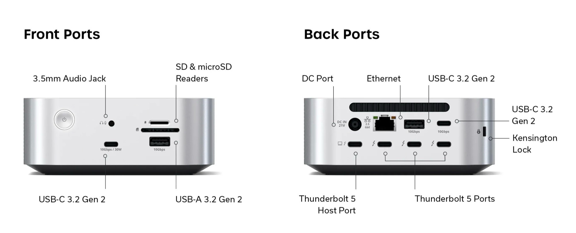 Док-станция подключается через Thunderbolt 5 с пропускной способностью 120 Гбит/с и может заряжать ноутбуки через тот же кабель мощностью до 140 Вт. Док-станция также совместима с компьютерами Mac, поддерживающими только Thunderbolt 4, хотя и с меньшей производительностью. На передней панели док-станции находится порт USB-C, который может заряжать устройства мощностью до 30 Вт и передавать данные со скоростью 10 Гбит/с. Кроме того, спереди расположены 3,5-мм разъем для наушников, один порт USB-A и устройство для чтения карт памяти SD и microSD.