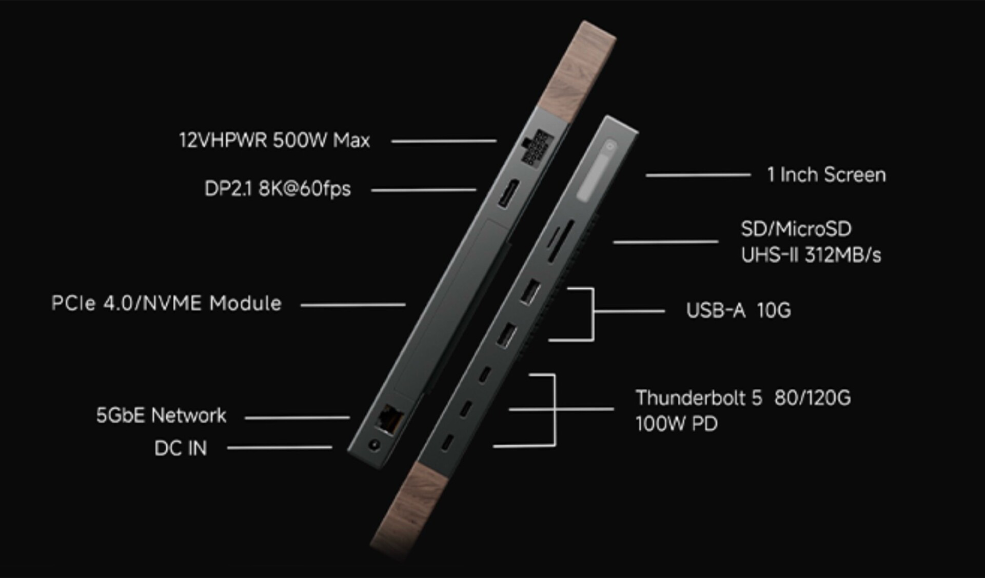 Подключенные ноутбуки могут заряжаться со скоростью до 100 Вт, а 1-дюймовый дисплей отображает текущее состояние док-станции. Самой необычной особенностью, пожалуй, является скрытый слот PCIe под крышкой сверху, который позволяет подключить обычный настольный GPU в сочетании с 500-ваттным блоком питания. Графическая карта подключается через PCIe 4.0 x4.