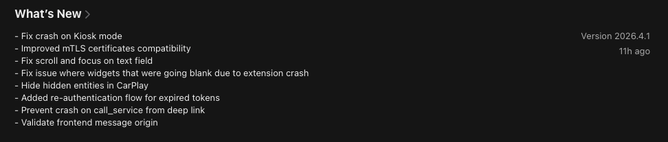 В примечаниях к выпуску приложения Home Assistant для iOS версии 2026.4.1 говорится, что был добавлен поток повторной аутентификации для токенов с истекшим сроком действия. Объекты, связанные с CarPlay, теперь можно скрыть, а совместимость сертификатов, относящихся к новой функции аутентификации Mutual Transport Layer Security (mTLS), была улучшена.