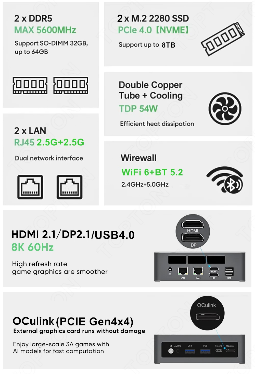 Также имеется порт OCuLink, позволяющий пользователям подключать в пару высокопроизводительным eGPU с мини-ПК. К слову о портах: помимо порта OCuLink, Topton D12 Ultra имеет следующие:
