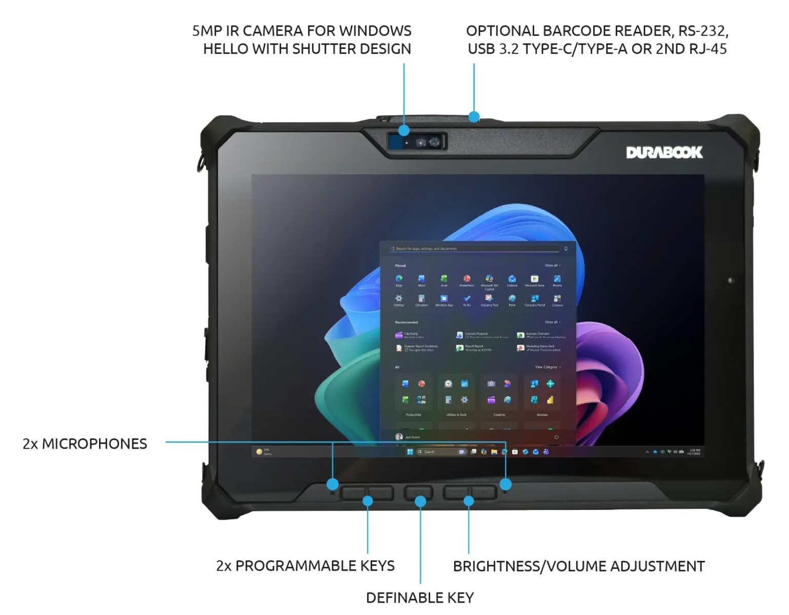 Все устройства оснащены интерфейсами 10/100/1000 Ethernet, Wi-Fi 7 и Bluetooth 5.4, а также фронтальной ИК-камерой 5 МП и задней камерой 11 МП с автофокусом и вспышкой, динамиком и двумя микрофонами для видеовстреч. Для подключения предусмотрены порт USB-C/Thunderbolt 4, порт USB-A 3.2 Gen2, аудиовход/выход, слот для карт памяти microSD, 20-контактный док-разъем, а также поддержка двух SIM-карт (Nano SIM и eSIM). Доступны дополнительные опции подключения и ввода, включая считыватель штрих-кодов.