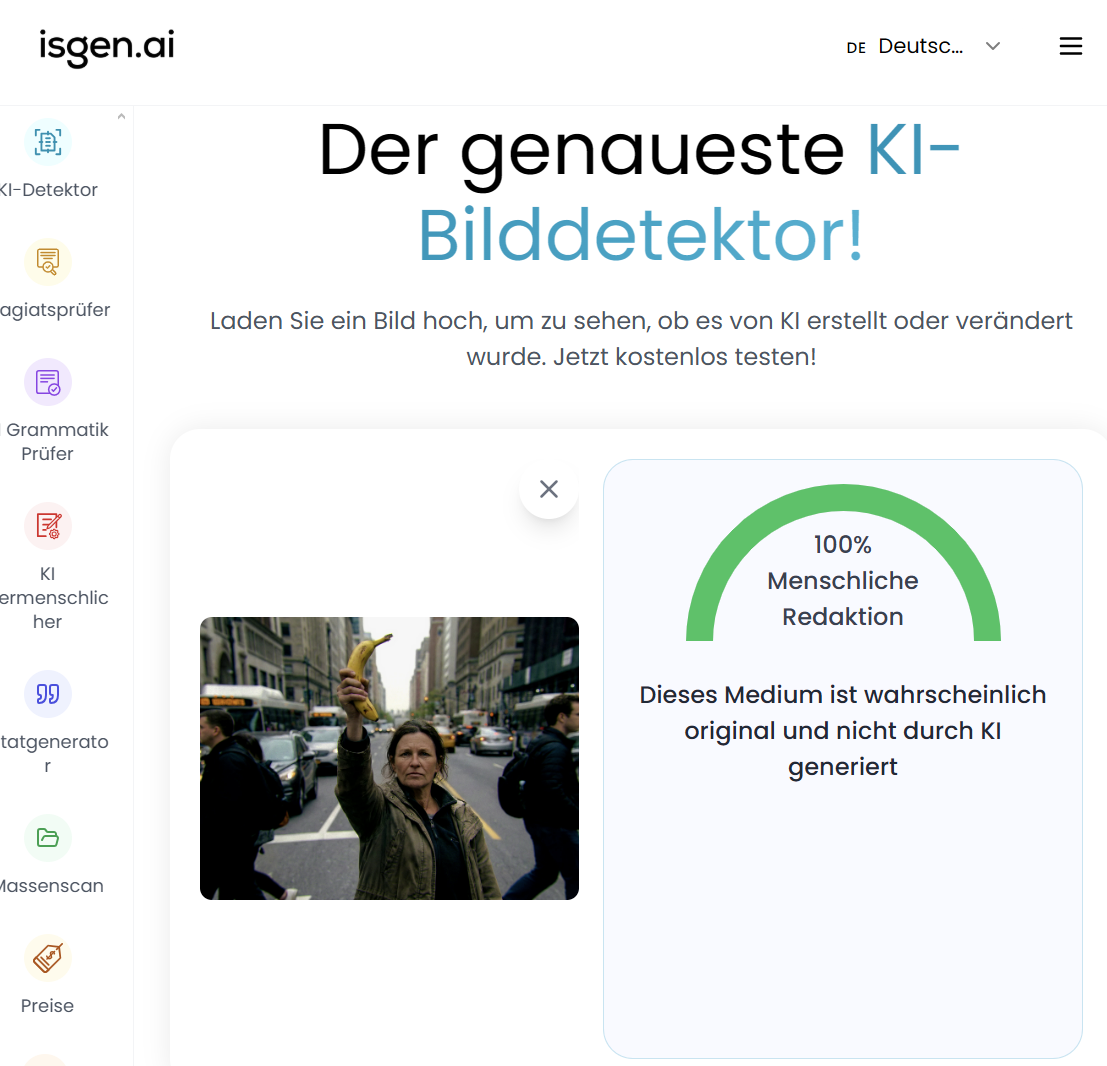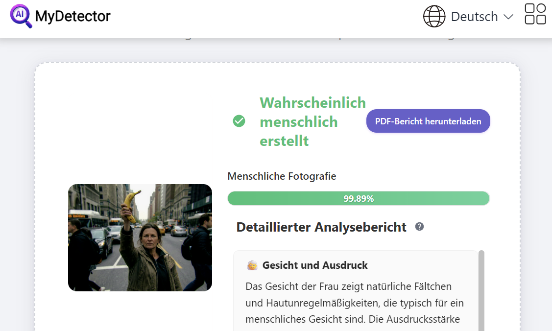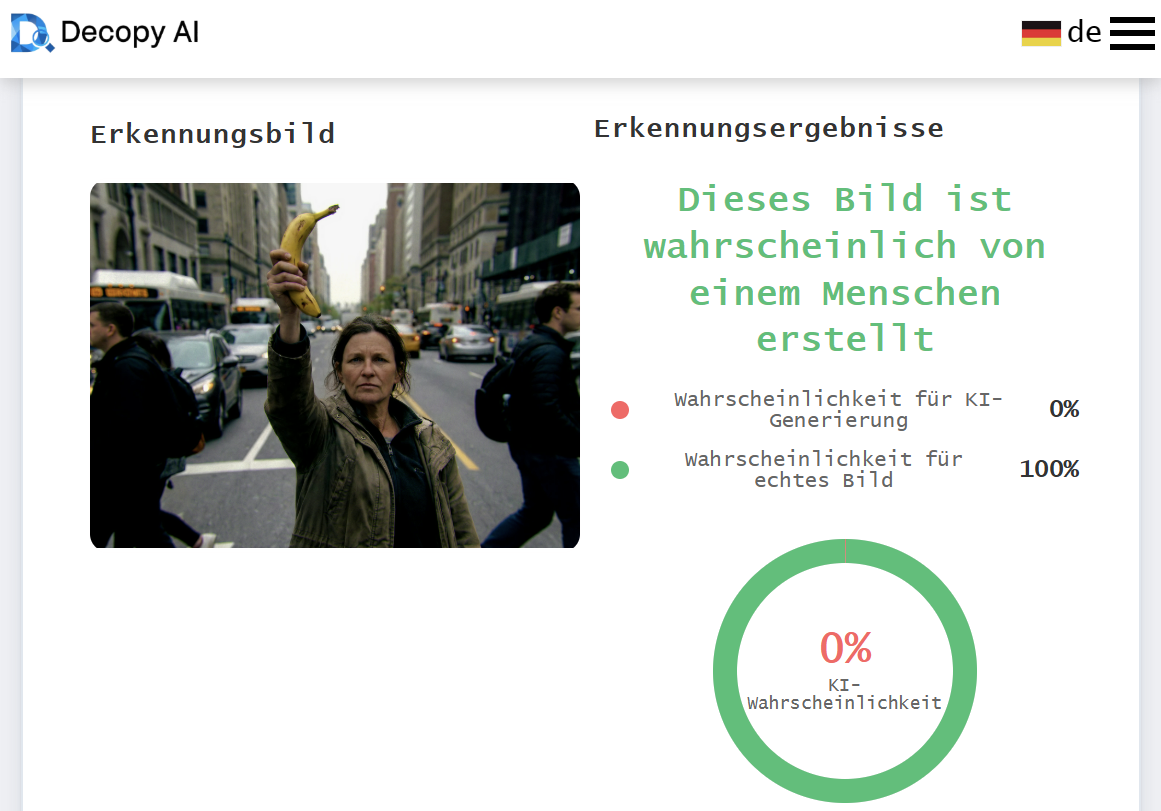 Результатом этого третьего раунда стало полное поражение технологии обнаружения. После того, как изображение прошло через стандартную постобработку, все шесть протестированных сервисов сдались. Ни один инструмент не показал ИИ-вероятность более 5%. Для программного обеспечения женщина, бьющая по банану, теперь, несомненно, была настоящей фотографией.