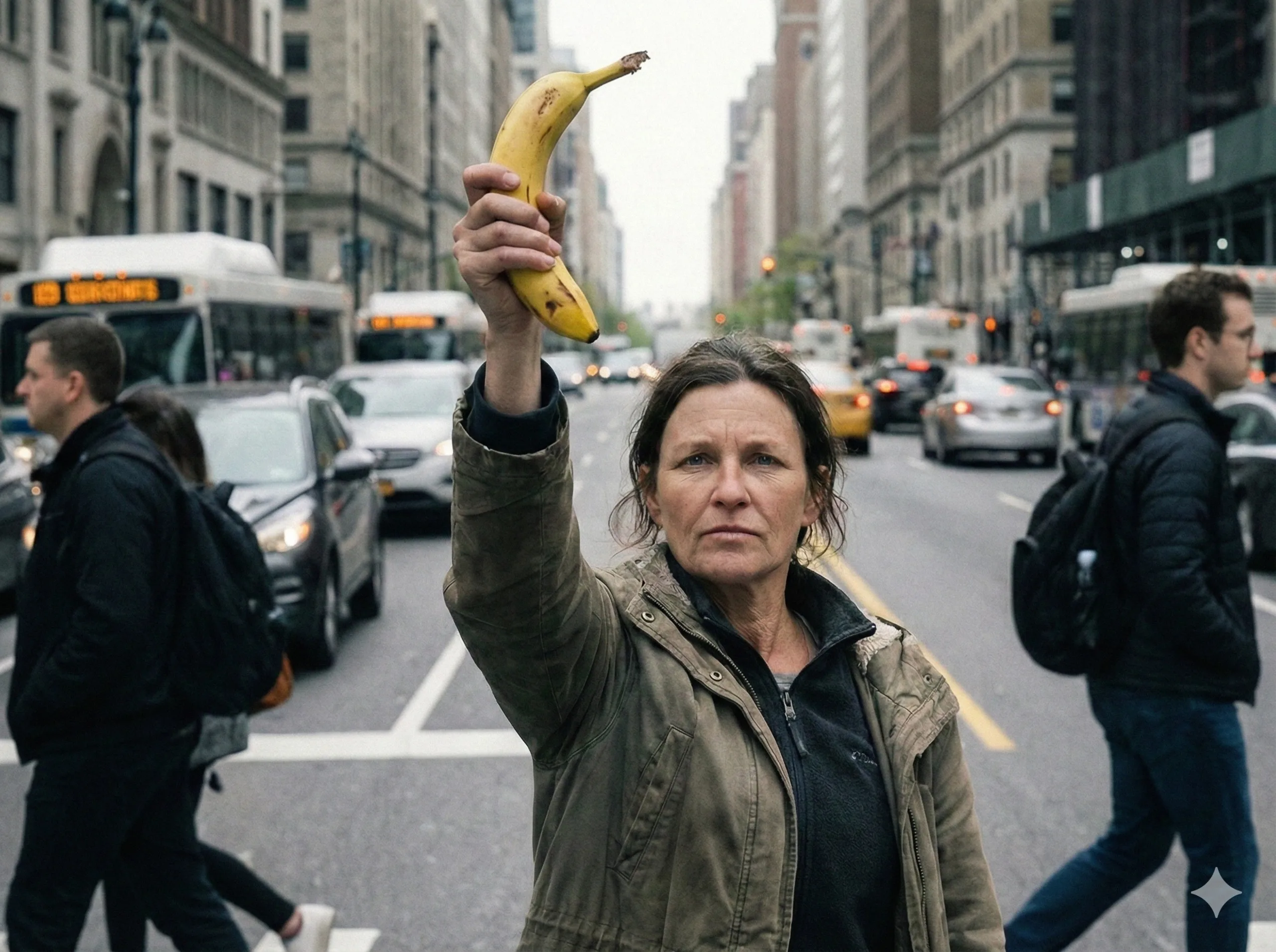 Чтобы испытать инструменты обнаружения, мы использовали генератор изображений "Nano Banana Pro", созданный на базе Google Gemini Задание было выбрано нарочито простое, но слегка причудливое: "Женщина в боевой позе держит банан на фоне неба. На заднем плане типичный городской пейзаж с незаинтересованными людьми"