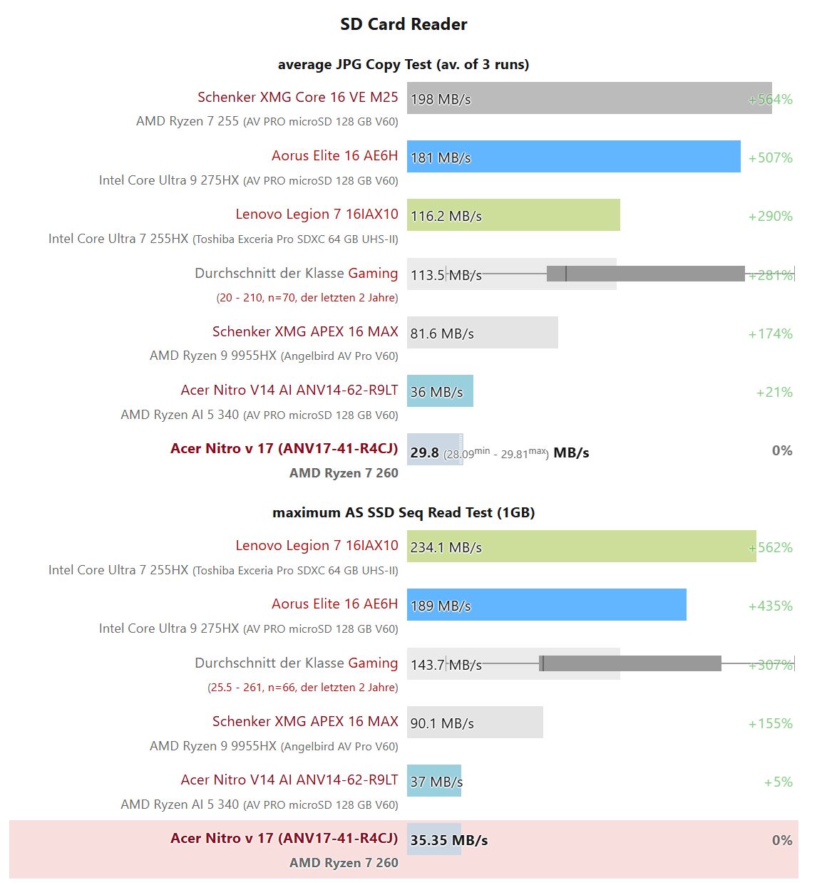 Здесь есть две плохие новости. Во-первых, встроенный ридер поддерживает только карты microSD. Во-вторых, устройство чтения карт SD в Nitro V 17 работает крайне медленно. В наших бенчмарках мы измеряли скорость передачи данных всего около 30 МБ/с. Средняя скорость в классе игровых ноутбуков значительно превышает 100 МБ/с.