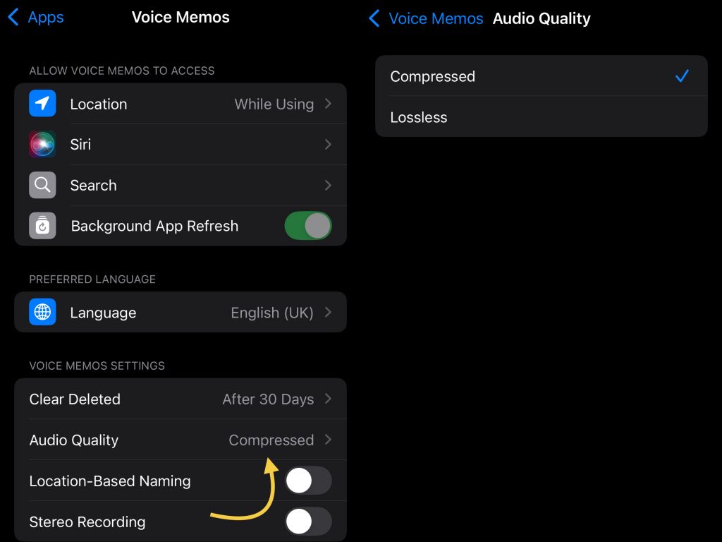 Если Вы зайдете в Настройки iPhone > Голосовые заметки > Аудио, Вы найдете два варианта качества - сжатое и без потерь.