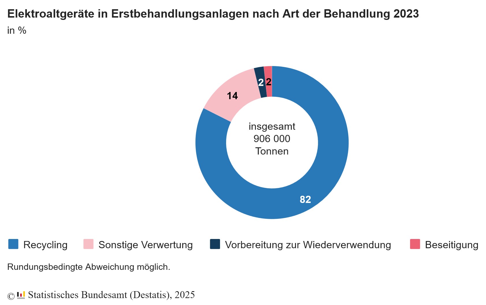 Переработка электронных отходов в Германии остается очень важным вопросом для перехода на сырье. По данным Федерального статистического управления Германии (Destatis), в 2023 году на сертифицированных предприятиях первичной обработки было переработано 906 100 тонн электронных отходов. Из них 747 000 тонн были переработаны, что соответствует уровню переработки 82,4%.