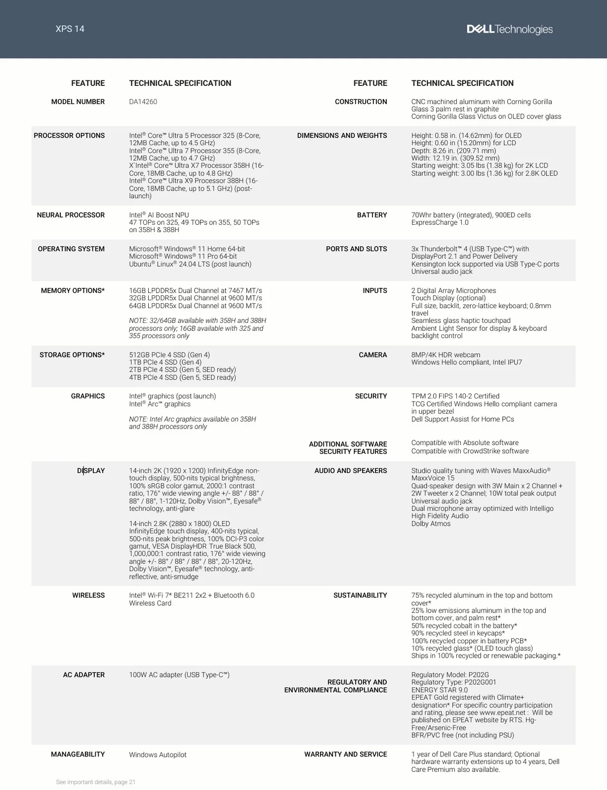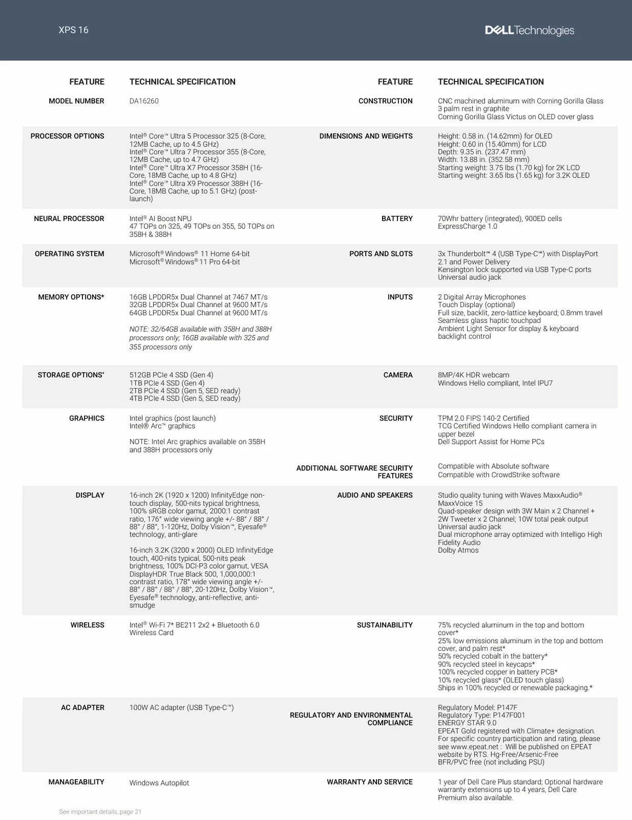 Разумеется, как и положено ноутбукам 2026 года, новые Dell XPS 14 и Dell XPS 16 оснащены процессорами новейшего поколения. В данном случае это процессоры Intel Panther Lake, включающие как базовые 8-ядерные версии (Intel Core Ultra 5 325, Core Ultra 7 355), так и гораздо более мощные процессоры класса H (Intel Core Ultra X7 358H, Core Ultra X9 388H), причем Core Ultra X7 и X9 включают новейшую графику ARC Graphics от Intel - выделенные GPU не предусмотрены. Доступно до 64 ГБ памяти LPDDR5X, SSD-накопители объемом до 4 ТБ.
