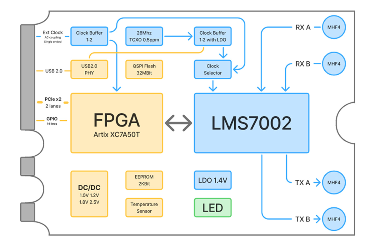 В основе xSDR лежит радиочастотный трансивер LMS7002M от Lime Microsystems, работающий в паре с ПЛИС AMD Artix-7 XC7A50T. Эта комбинация охватывает диапазон настройки от 30 МГц до 3,8 ГГц. SDR поддерживает частоту дискретизации от 0,1 MSPS до 122,88 MSPS в режиме SISO и более 80 MSPS в режиме MIMO, с полосой пропускания канала от 0,5 МГц до 90 МГц. Четыре антенных разъема MHF4 обеспечивают доступ к двум каналам RX и двум каналам TX.