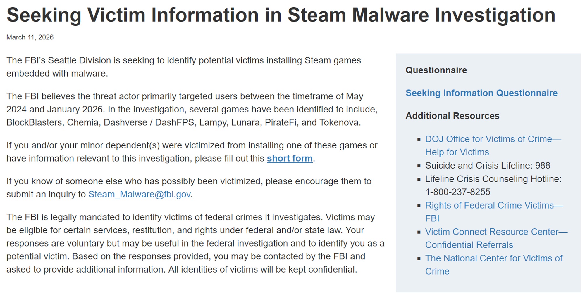 После серии зараженных вредоносным ПО игр Steam появившихся за последние несколько лет, ФБР ФБР обратило на это внимание. На своем сайте https://www.fbi.gov/how-we-can-help-you/victim-services/seeking-victim-information/seeking-victim-information-in-steam-malware-investigationфБР перечисляет ряд пострадавших игр и просит жертв отправить форму с дополнительной информацией. Компания Valve также подтвердила, что сообщение является легитимным, и предлагает геймерам помочь в расследовании.