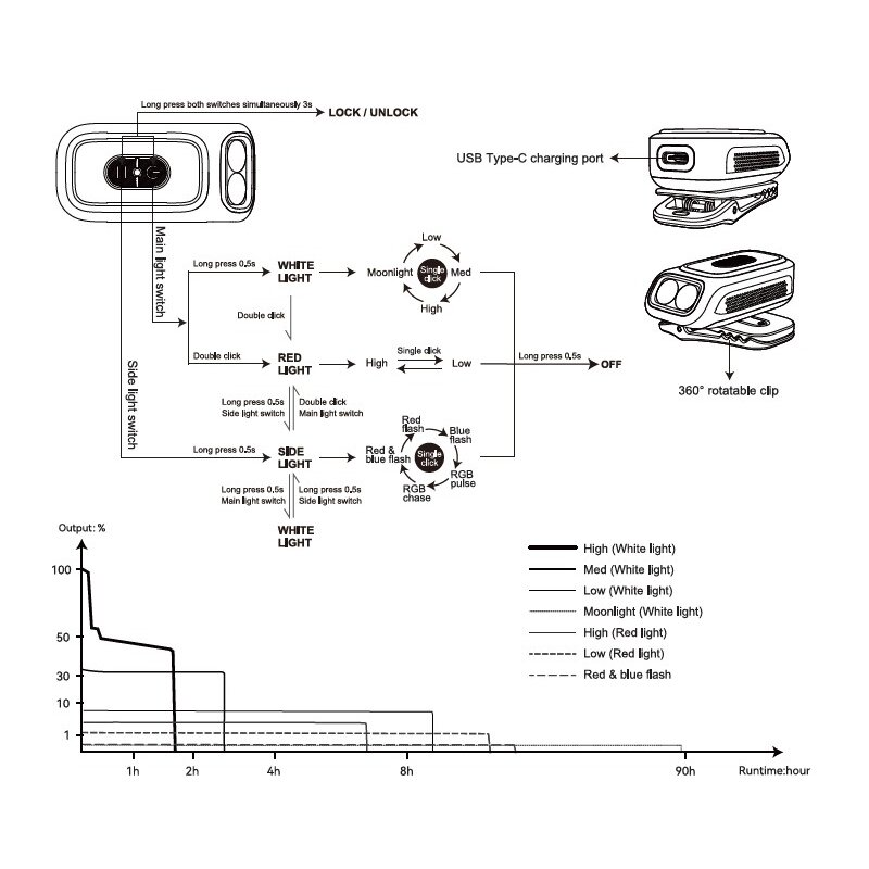 Это позволяет направлять основной свет, состоящий из двух светодиодов, в разные стороны по мере необходимости. Кроме того, свет излучается под углом 40 градусов, что удобно при креплении к карману куртки или лямке рюкзака. Он обеспечивает яркость до 300 люмен или дальность действия до 151 фута. Fenix указывает время автономной работы 1 час 40 минут в этом высоком режиме, но отмечает, что здесь действует температурный режим. Другими словами, светодиоды тускнеют, если устройство слишком сильно нагревается.