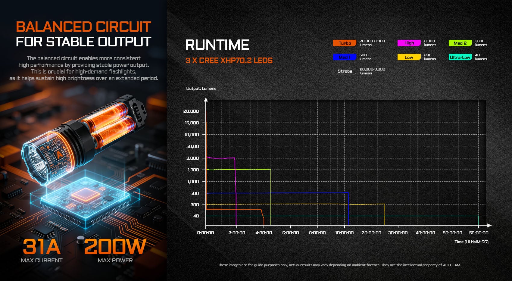 Тем не менее, Acebeam X30 может поддерживать пиковую яркость трех светодиодов 6500K только в течение очень короткого времени. При полном заряде батареи 20 000 люмен и дальность действия более 650 ярдов доступны всего на 15 секунд. После этого высокий режим обеспечивает яркость 3 000 люмен и дальность 185 ярдов в течение 1 часа 50 минут. Если предварительно не использовать турбо-режим, этот режим предположительно продлится на 5 минут дольше.