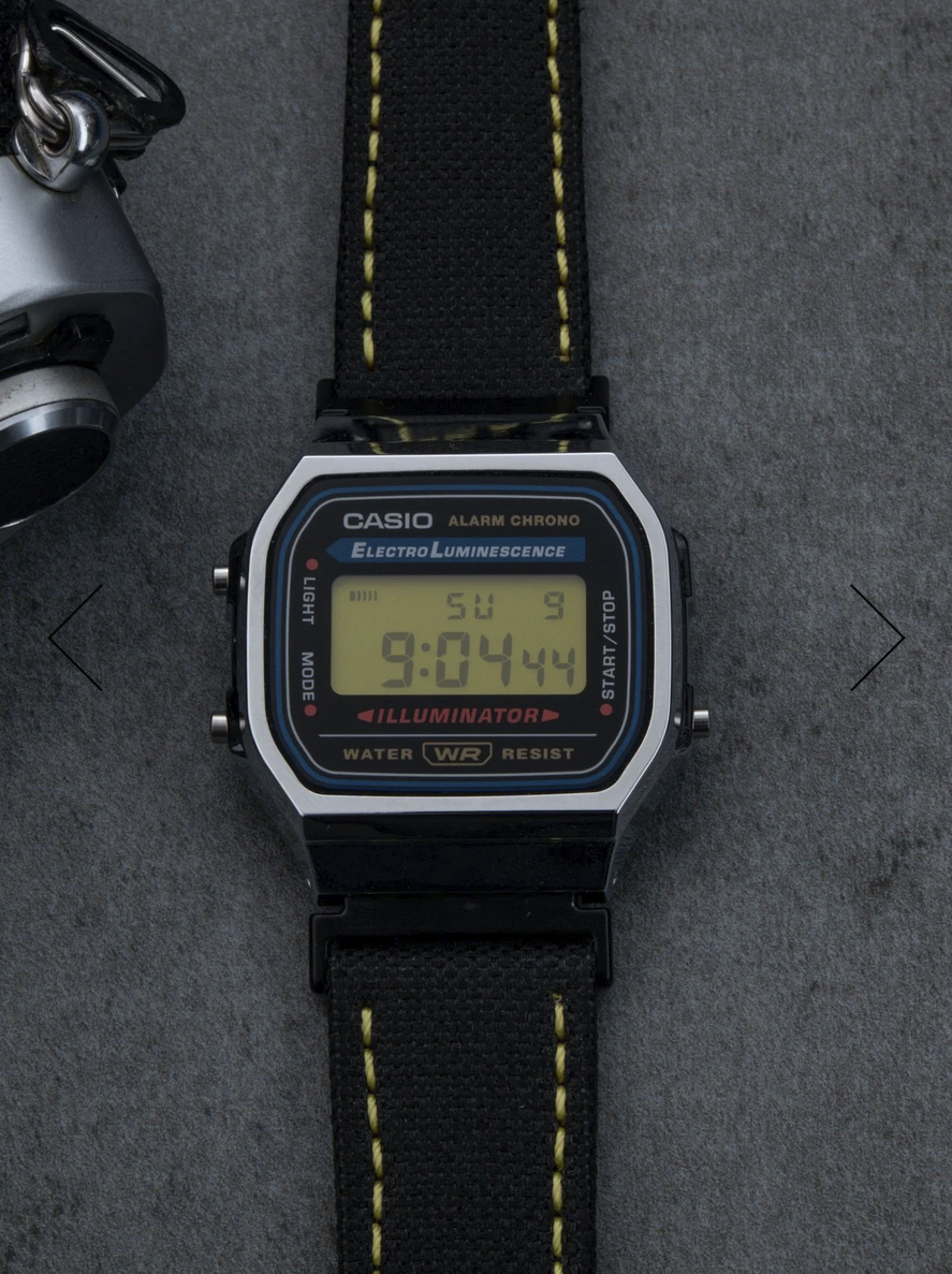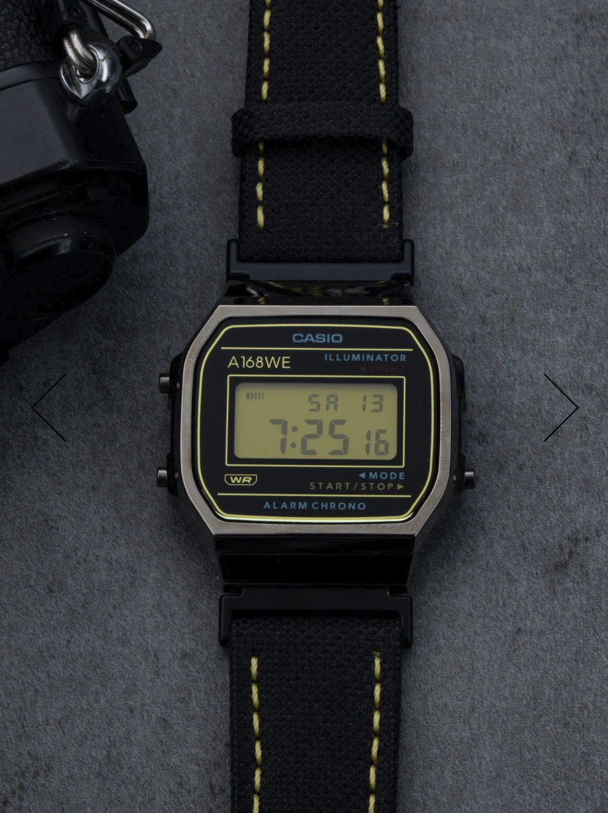 Основа часов не изменилась. В них по-прежнему используется стандартный цифровой модуль A168 с будильником, секундомером и подсветкой. Нет никаких признаков функциональных обновлений, поэтому основной упор здесь сделан на стиль и дизайн, а не на дополнительные функции. Дисплей имеет желтый оттенок, что является явной отсылкой к цветам Nikon. Для ремешка использован черный холст с желтой строчкой, что очень похоже на ремешки для фотоаппаратов. Форма корпуса осталась близкой к оригиналу. Брендинг, такой как "Illuminator", все еще виден, что дает понять, что это не полный редизайн.