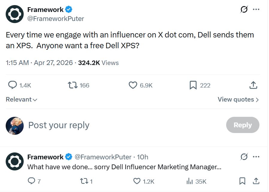 Естественно, что известные OEM-производители ноутбуков, похоже, теперь серьезно относятся к Framework. Framework утверждает, что "каждый раз, когда мы общаемся с влиятельным человеком на X dot com, Dell присылает ему XPS". Сообщение набрало приличный трафикна момент написания статьи он набрал более 320 тысяч просмотров. Это привело к тому, что многие люди в шутку просят Framework взаимодействовать с ними в надежде получить XPS от Dell.
