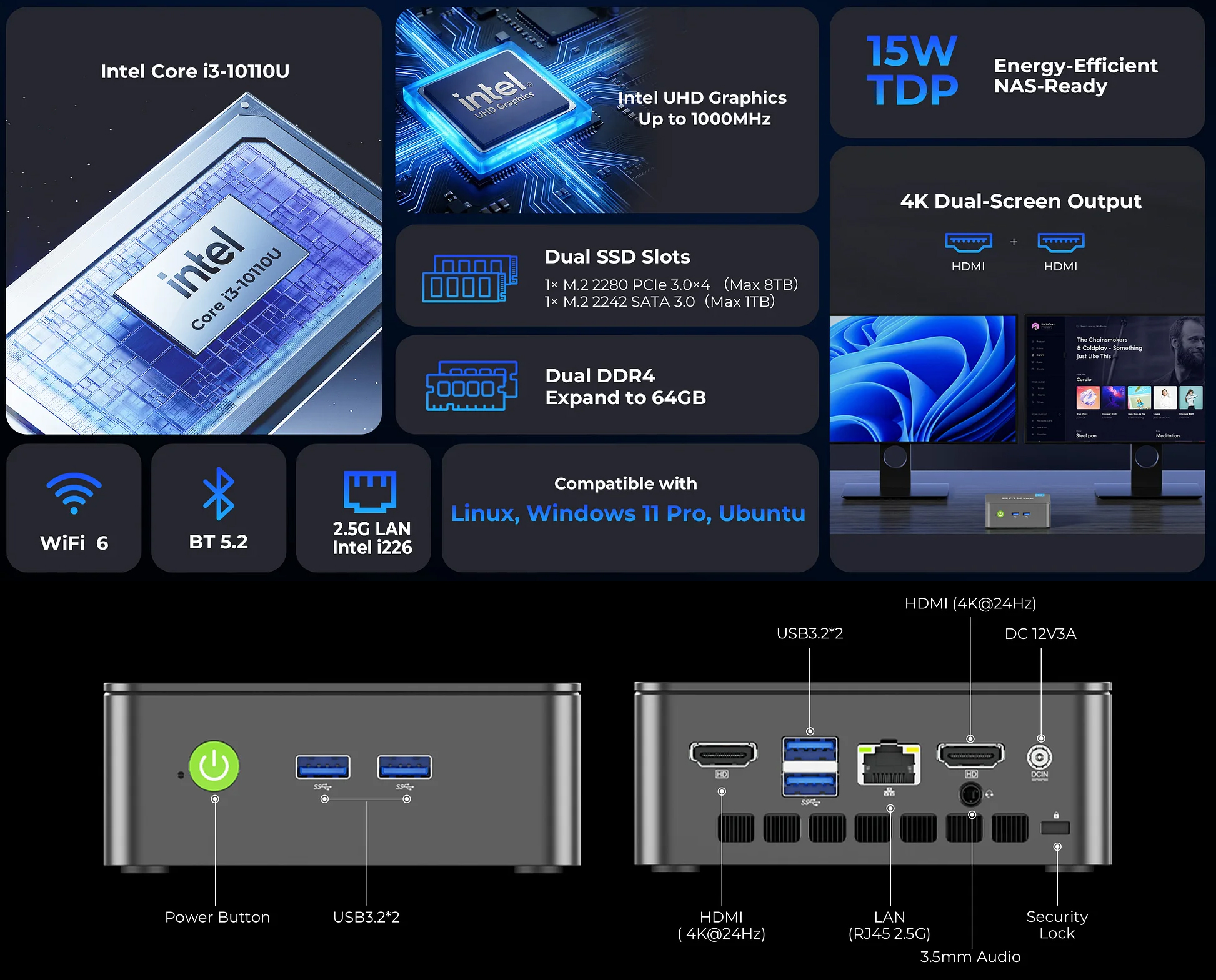 Под капотом у GMK NucBox G3 Pro находятся Intel Core i3 10110U. Это двухъядерный процессор из линейки Comet Lake, и он может работать в паре с до 64 Гб оперативной памяти DDR4 через два слота SO-DIMM. Имеются два слота M.2, в которые можно установить до 9 ТБ памяти (2 ТБ Silicon Power Gen 3 по цене $249,97 на Amazon).