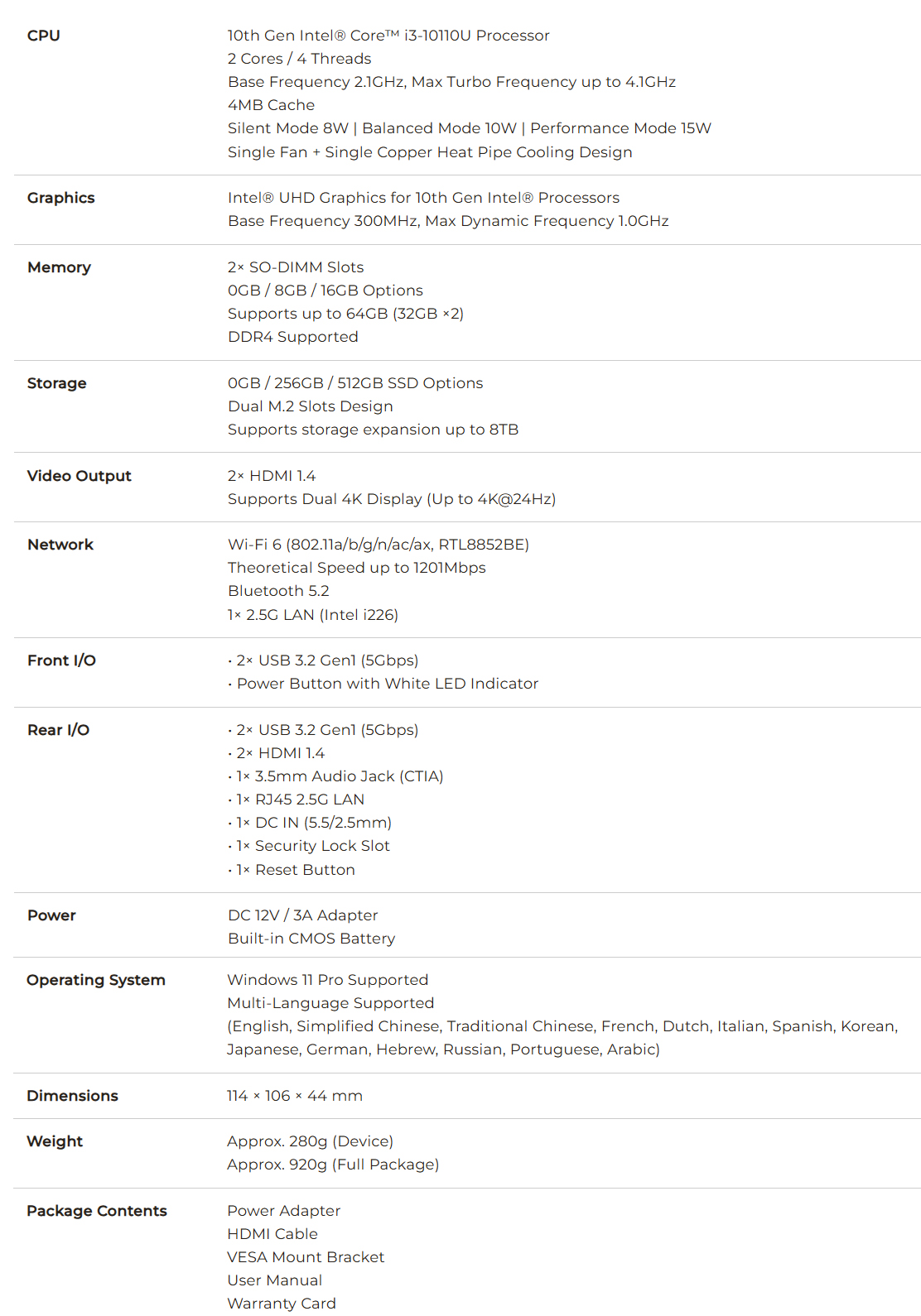 Кроме того, есть Bluetooth 5.2 и двухдиапазонный WiFi 6 для беспроводного подключения. NucBox G3 Pro также имеет относительно компактный форм-фактор и поддерживает крепления VESA. Ознакомьтесь с техническими характеристиками, приложенными ниже, чтобы узнать больше об этом мини-ПК.