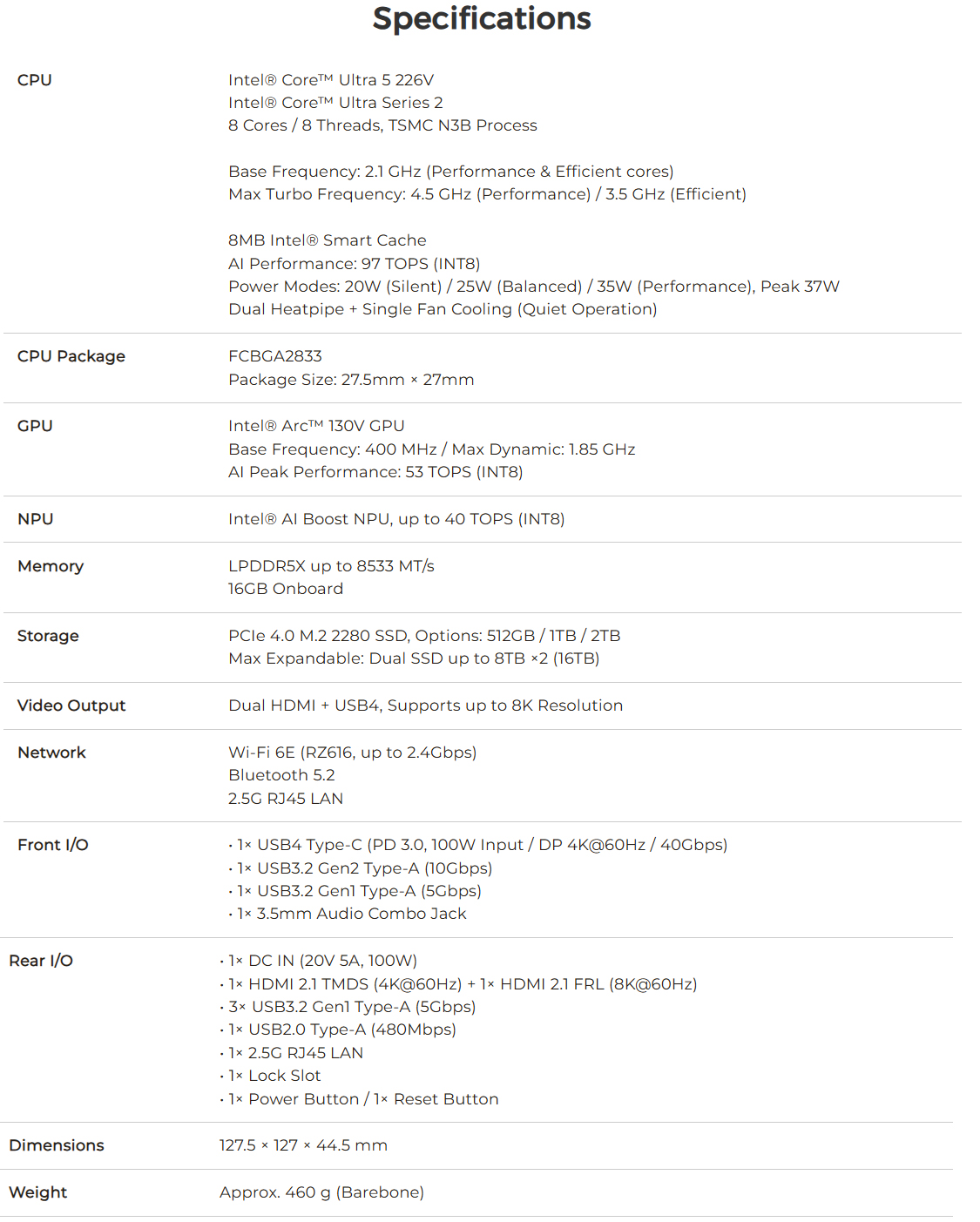 Под капотом NucBox K17 установлен Intel Core Ultra 5 226V, процессор начального уровня из линейки Lunar Lake. Этот процессор оснащен iGPU Arc 130Vкоторый может предложить игровую производительность, близкую к Radeon 780M при разрешении 1080p.