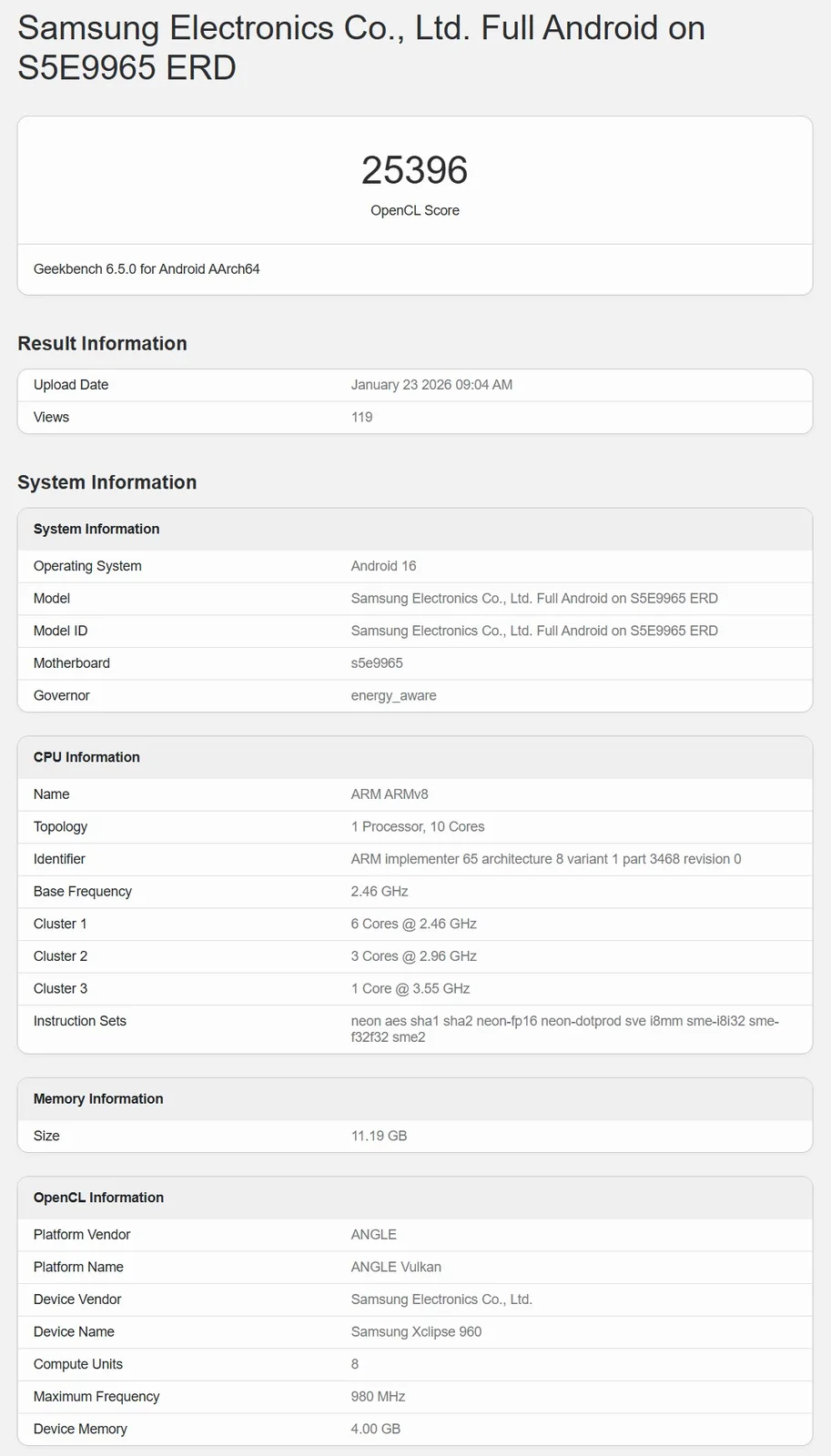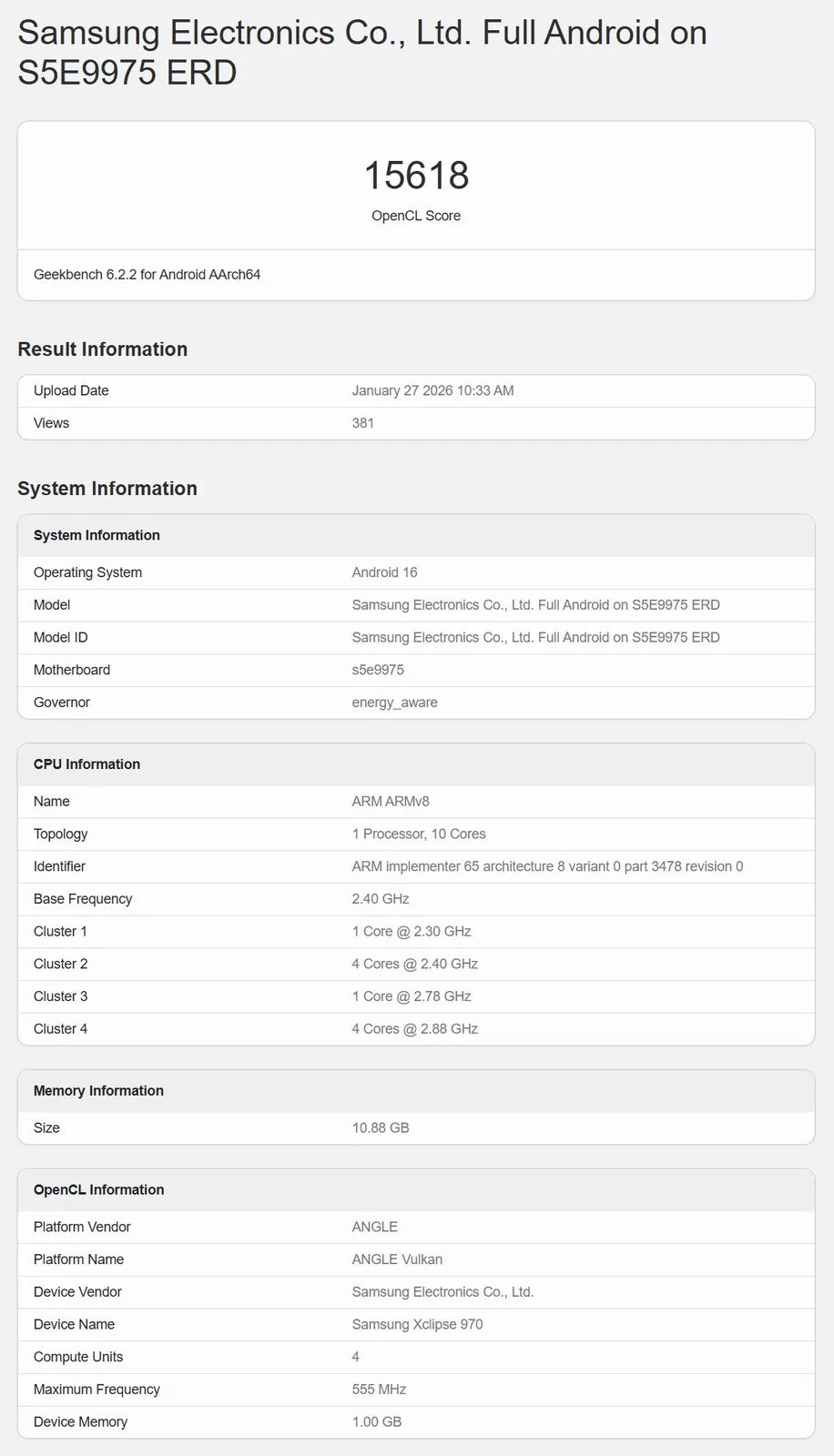 Если модель с номером S5E9975 ERD действительно является тестовой системой Samsung для преемника Exynos 2600то в настоящее время она показывает очень низкие результаты. Здесь измерялась производительность графического процессора, который, как и ожидалось, представляет собой Samsung Xclipse 970 и, согласно Geekbench, оснащен 4 вычислительными блоками с тактовой частотой 555 МГц. Это примерно в два раза меньше и в два раза быстрее, чем тестовая система Exynos 2600, которая уже успела отметиться на сайте в Geekbench несколько раз. Учитывая, что графический процессор лишь в два раза мощнее, результат в 15 618 баллов в тесте OpenCL не так уж плох, но, конечно, все еще значительно ниже уровня тестовой системы Exynos 2600