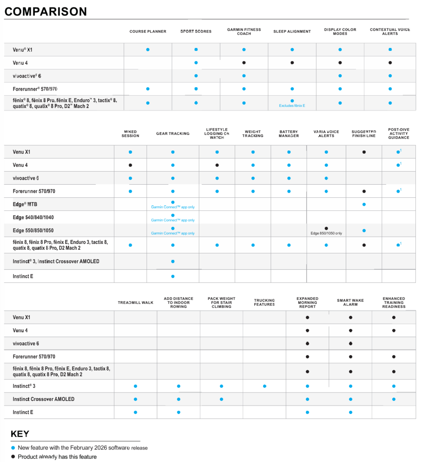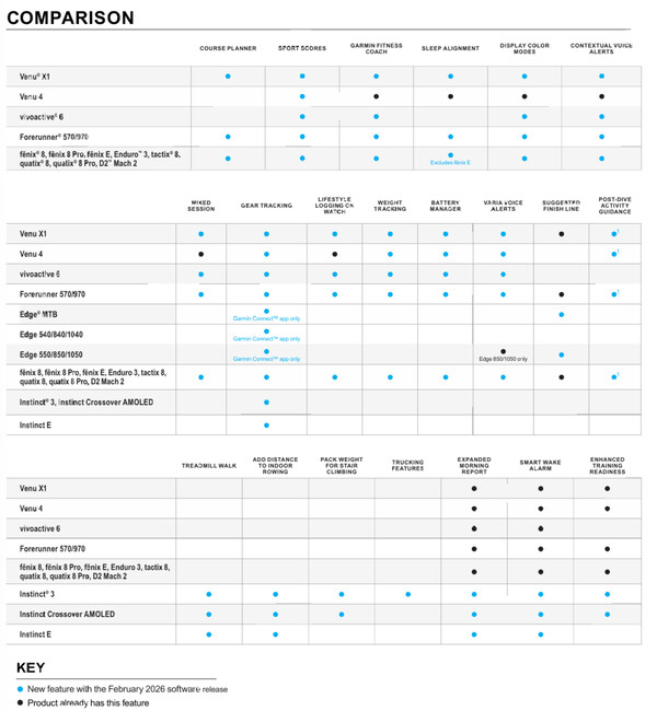 Таким образом, некоторые из функций, представленных в графике и сравнительной таблице ниже, возможно, уже появились на некоторых смарт-часах. Для справки, компания Garmin включила следующие смарт-часы в свое обновление Feature Update от февраля 2026 года: