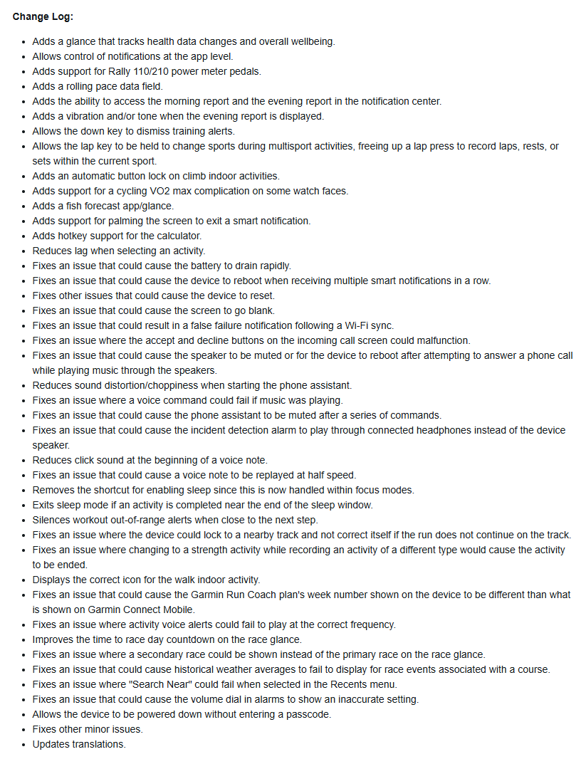 В этом стабильном выпуске также решены различные проблемы, такие как более быстрый, чем ожидалось, разряд батареи, неожиданные перезагрузки устройства и отключение экрана без предупреждения. Между двумя журналами изменений есть только одно отличие: в них добавлено исправление ошибки для Forerunner 970, устраняющее проблему с функцией "Поиск поблизости" на картах, которая работала не так, как ожидалось. Полные примечания к выпуску версии 15.16 Вы можете найти ниже.