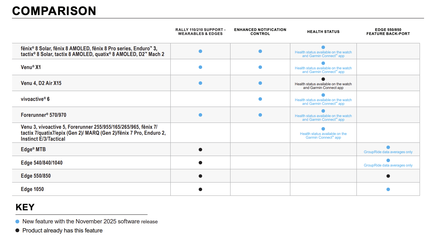 Что касается остальных обновлений Garmin, то многие из них относятся к серии велокомпьютеров, например, Smart Fueling и анализ соотношения передач. При этом Garmin также предлагает улучшенное управление уведомлениями для Fenix 8, Forerunner 970, Venu 4 и Venu X1, а также других соответствующих смарт-часов. Более того, Garmin добавил поддержку Rally 110 и Rally 210 для множества носимых устройств в обновлении November 2025 Feature Update, как показано на изображении выше.